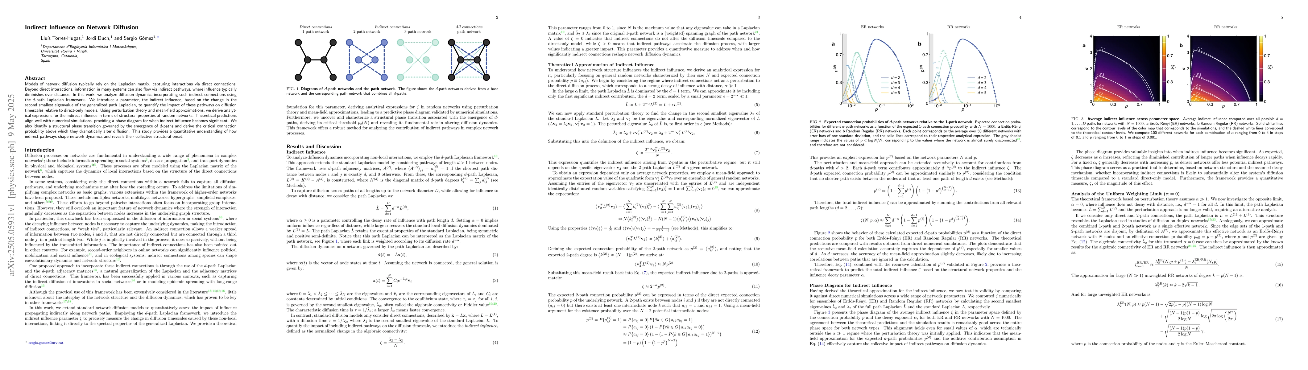 Models of network diffusion typically rely on the Laplacian matrix, capturing interactions via direct connections. Beyond direct interactions, information in many systems can also flow via indirect pathways, where influence typically diminishes over distance. In this work, we analyze diffusion dynamics incorporating such indirect connections using the $d$-path Laplacian framework. We introduce a parameter, the indirect influence, based on the change in the second smallest eigenvalue of the generalized path Laplacian, to quantify the impact of these pathways on diffusion timescales relative to direct-only models. Using perturbation theory and mean-field approximations, we derive analytical expressions for the indirect influence in terms of structural properties of random networks. Theoretical predictions align well with numerical simulations, providing a phase diagram for when indirect influence becomes significant. We also identify a structural phase transition governed by the emergence of $d$-paths and derive the critical connection probability above which they dramatically alter diffusion. This study provides a quantitative understanding of how indirect pathways shape network dynamics and reveals their collective structural onset.
