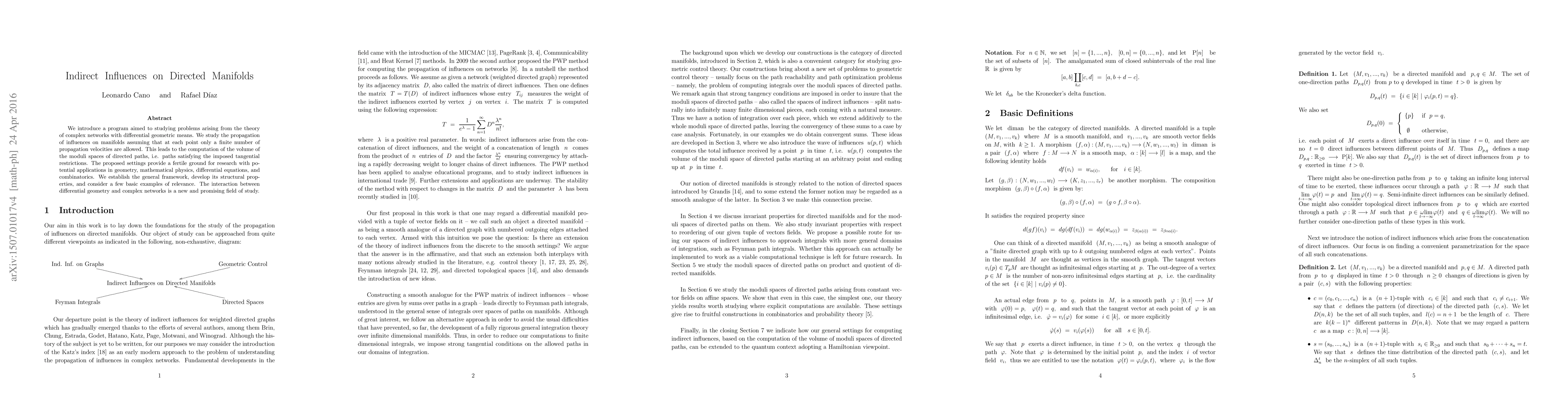 We introduce a program aimed to studying problems arising from the theory of complex networks with differential geometric means. We study the propagation of influences on manifolds assuming that at each point only a finite number of propagation velocities are allowed. This leads to the computation of the volume of the moduli spaces of directed paths, i.e. paths satisfying the imposed tangential restrictions. The proposed settings provide a fertile ground for research with potential applications in geometry, mathematical physics, differential equations, and combinatorics. We establish the general framework, develop its structural properties, and consider a few basic examples of relevance. The interaction between differential geometry and complex networks is a new and promising field of study.