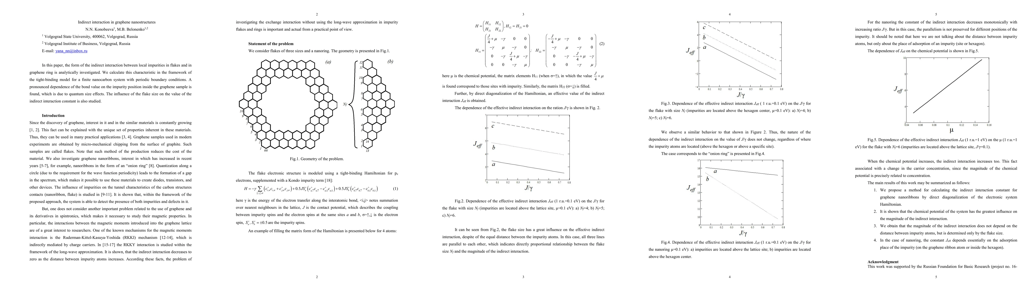 This paper analytically investigates indirect interactions between local impurities in graphene flakes and rings using a tight-binding model. The study finds a significant dependency of bond values on impurity position due to quantum size effects, and explores how flake size influences the indirect interaction constant.