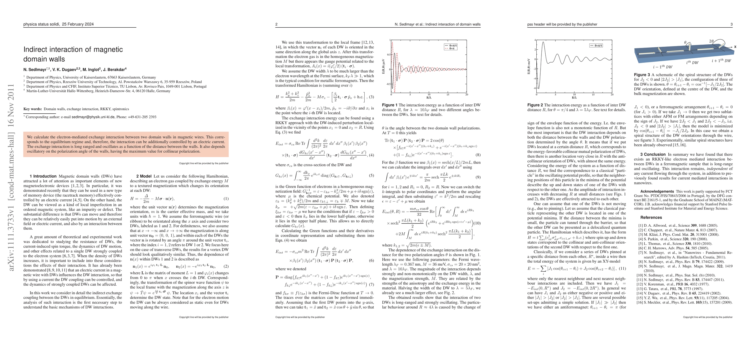 This study investigates the electron-mediated exchange interaction between two magnetic domain walls in wires, revealing a long-range oscillatory interaction influenced by the distance and polarization angle between the walls, with maximum interaction for collinear polarization. An electric current can additionally modulate this interaction in the equilibrium regime.