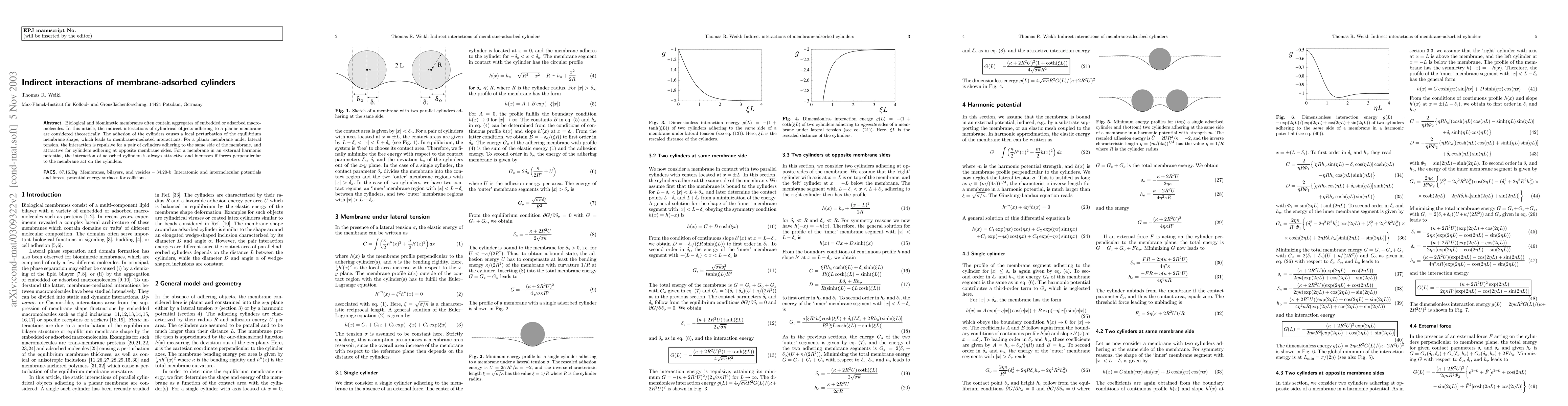 Biological and biomimetic membranes often contain aggregates of embedded or adsorbed macromolecules. In this article, the indirect interactions of cylindrical objects adhering to a planar membrane are considered theoretically. The adhesion of the cylinders causes a local perturbation of the equilibrium membrane shape, which leads to membrane-mediated interactions. For a planar membrane under lateral tension, the interaction is repulsive for a pair of cylinders adhering to the same side of the membrane, and attractive for cylinders adhering at opposite membrane sides. For a membrane in an external harmonic potential, the interaction of adsorbed cylinders is always attractive and increases if forces perpendicular to the membrane act on the cylinders.