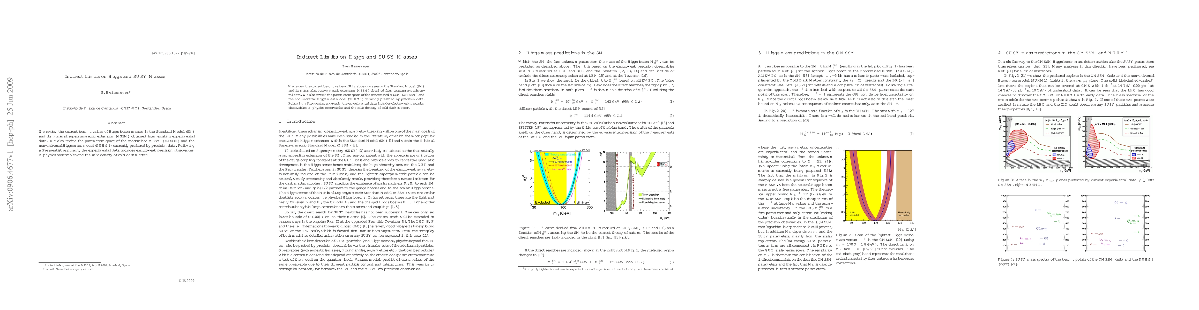 We review the current best fit values of Higgs boson masses in the Standard Model (SM) and its minimal supersymmetric extension (MSSM) obtained from existing experimental data. We also review the parameters space of the constrained MSSM (CMSSM) and the non-universal Higgs mass model (NUHM1) currently preferred by precision data. Following a Frequentist approach, the experimental data includes electroweak precision observables, B physics observables and the relic density of cold dark matter.