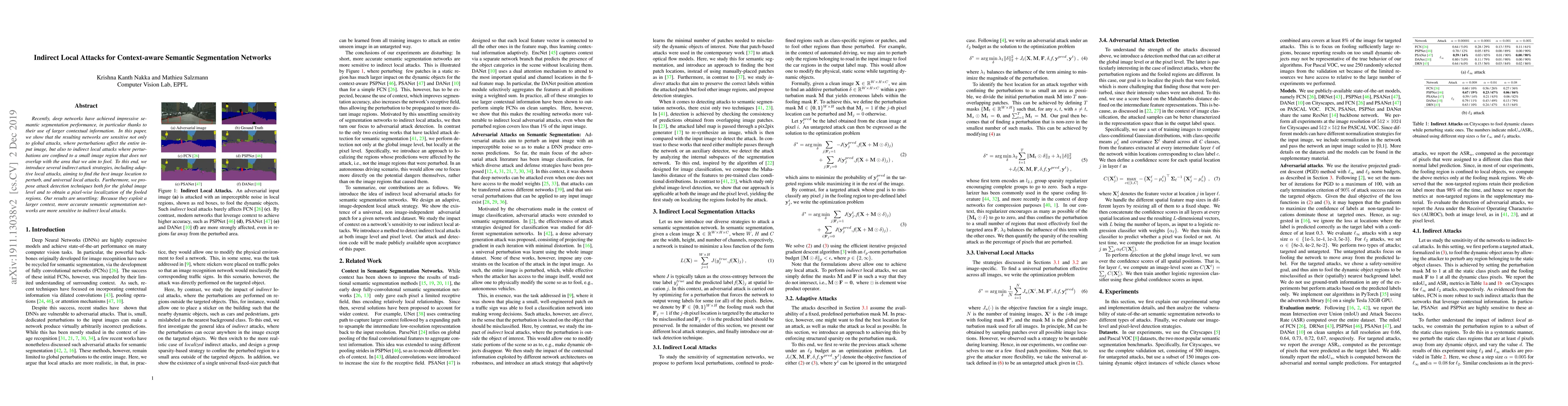 This research highlights the vulnerability of advanced semantic segmentation networks to indirect local attacks, emphasizing the need for improved defense mechanisms against such attacks, which can have serious implications in real-world applications like autonomous driving.