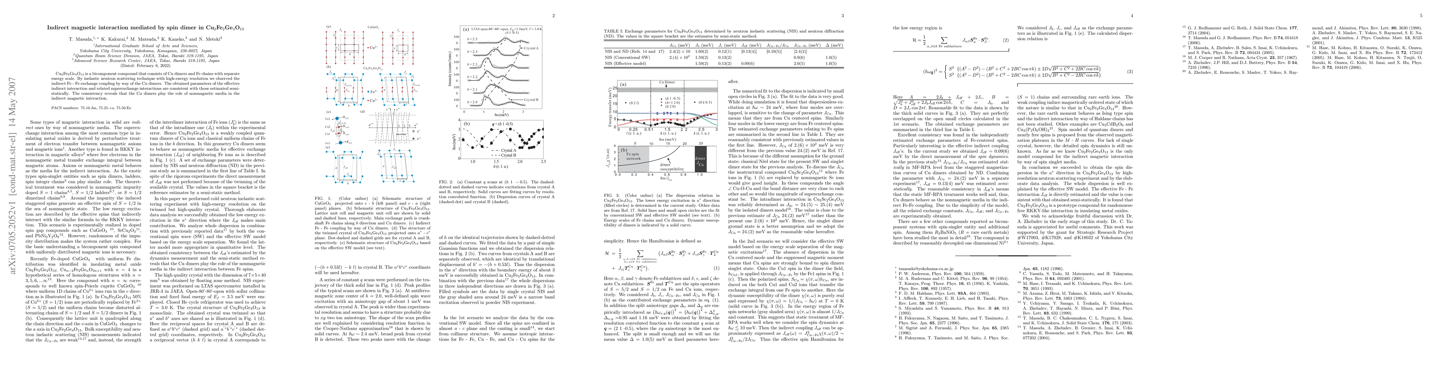 Cu$_2$Fe$_2$Ge$_4$O$_{13}$ is a bicomponent compound that consists of Cu dimers and Fe chains with separate energy scale. By inelastic neutron scattering technique with high-energy resolution we observed the indirect Fe - Fe exchange coupling by way of the Cu dimers. The obtained parameters of the effective indirect interaction and related superexchange interactions are consistent with those estimated semi-statically. The consistency reveals that the Cu dimers play the role of nonmagnetic media in the indirect magnetic interaction.