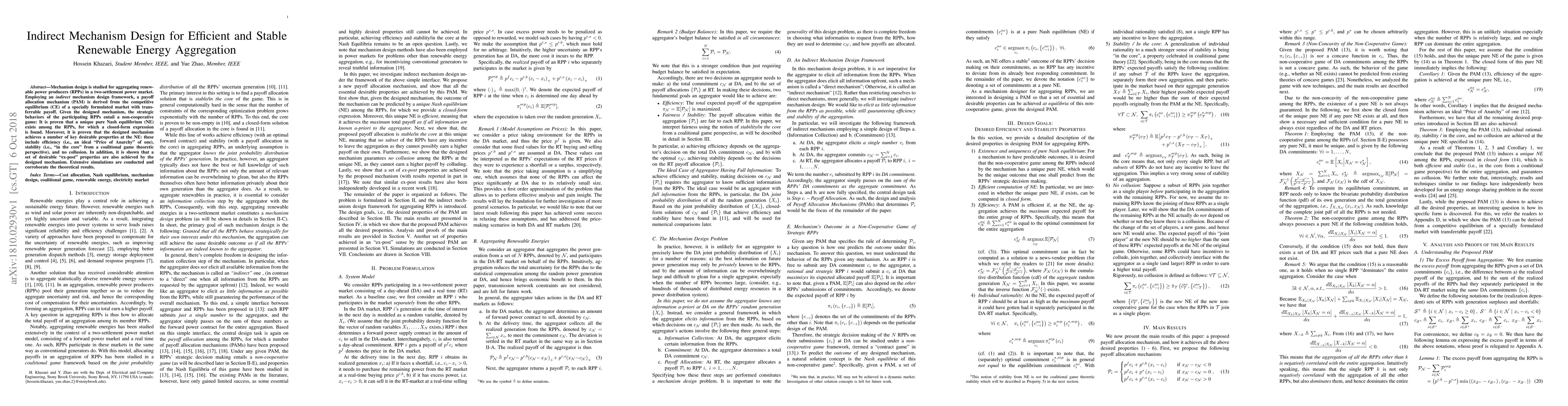 This paper proposes an indirect mechanism design for aggregating renewable power producers, ensuring efficiency, stability, and no collusion in a two-settlement power market. The derived payoff allocation mechanism achieves a unique pure Nash equilibrium with desirable "ex-post" properties, validated through extensive simulations.