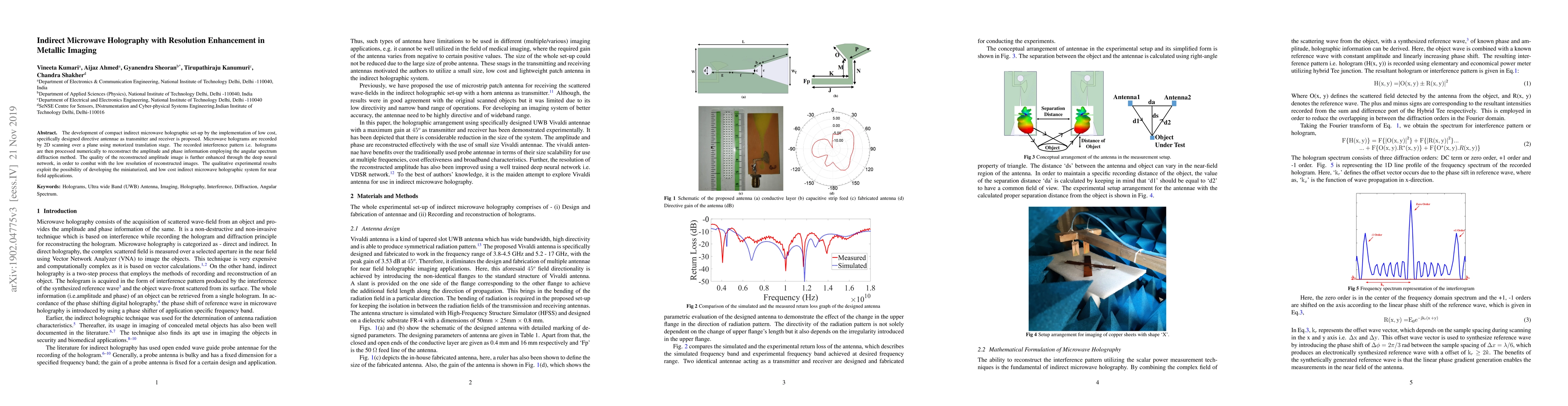 The development of compact indirect microwave holographic set-up by the implementation of low cost, specifically designed directive antennae as transmitter and receiver is proposed. Microwave holograms are recorded by 2D scanning over a plane using motorized translation stage. The recorded interference pattern i.e. holograms are then processed numerically to reconstruct the amplitude and phase information employing the angular spectrum diffraction method. The quality of the reconstructed amplitude image is further enhanced through the deep neural network, in order to combat with the low resolution of reconstructed images. The qualitative experimental results exploit the possibility of developing the miniaturized, and low cost indirect microwave holographic system for near field applications.