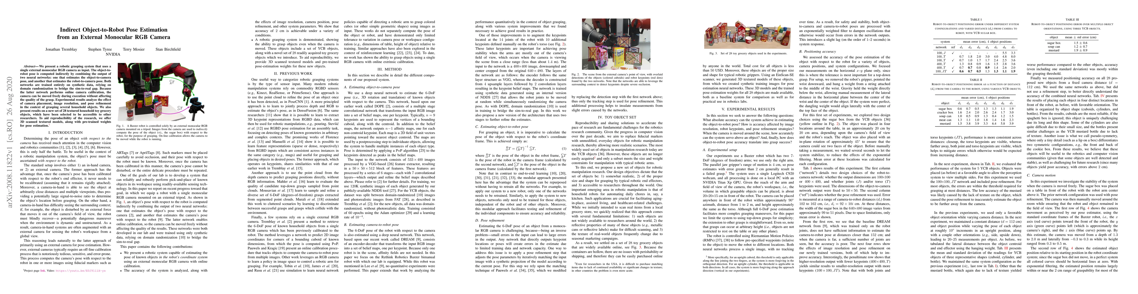 This paper proposes a robotic grasping system using a single external monocular RGB camera, estimating object-to-robot pose via two neural networks trained on synthetic data. The system demonstrates robustness to camera movement and provides new textured household objects dataset for reproducibility.