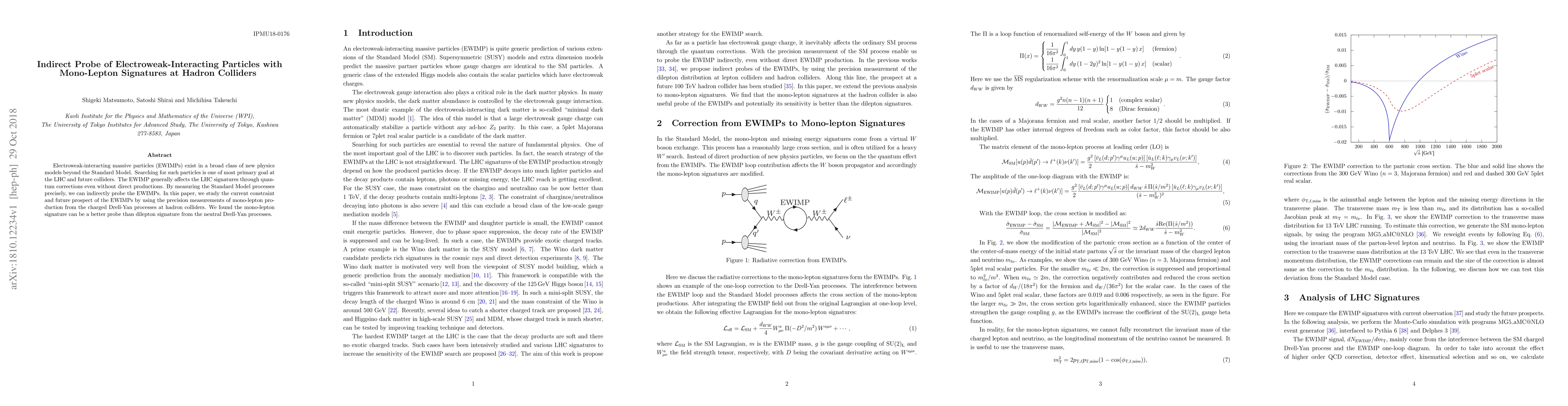 This paper investigates the indirect detection of electroweak-interacting massive particles (EWIMPs) through precision measurements of mono-lepton production at hadron colliders, finding that this signature offers a more effective probe than the dilepton signature from neutral Drell-Yan processes. The study assesses current constraints and future prospects for EWIMPs in new physics models beyond the Standard Model.
