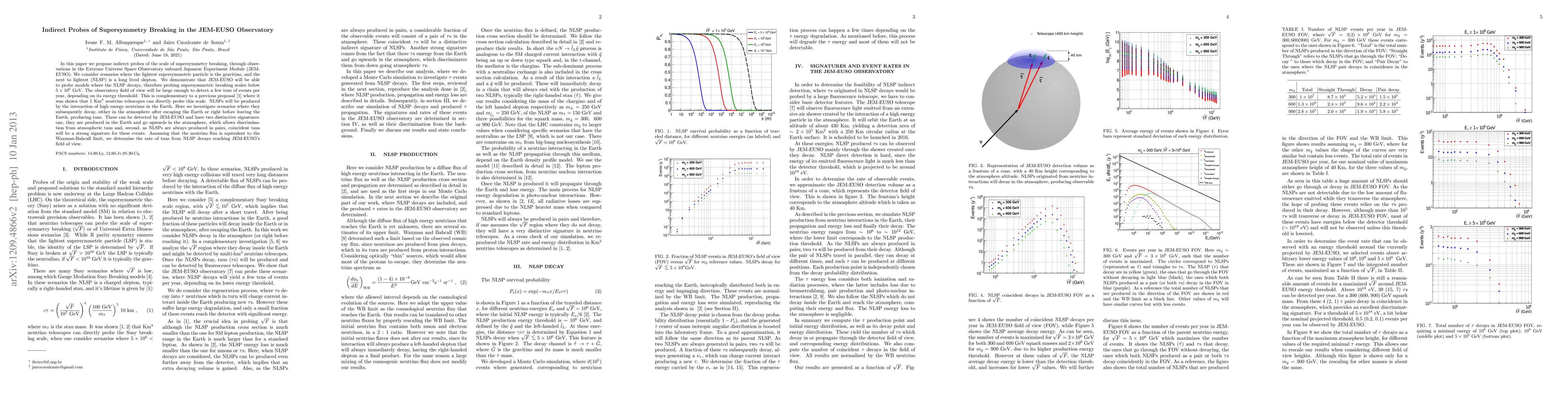 In this paper we propose indirect probes of the scale of supersymmetry breaking, through observations in the Extreme Universe Space Observatory onboard Japanese Experiment Module (JEM-EUSO). We consider scenarios where the lightest supersymmetric particle is the gravitino, and the next to lightest (NLSP) is a long lived slepton. We demonstrate that JEM-EUSO will be able to probe models where the NLSP decays, therefore probing supersymmetric breaking scales below $5 \times 10^6$ GeV. The observatory field of view will be large enough to detect a few tens of events per year, depending on its energy threshold. This is complementary to a previous proposal (Albuquerque et al., 2004) where it was shown that 1 Km$^3$ neutrino telescopes can directly probe this scale. NLSPs will be produced by the interaction of high energy neutrinos in the Earth. Here we investigate scenarios where they subsequently decay, either in the atmosphere after escaping the Earth or right before leaving the Earth, producing taus. These can be detected by JEM-EUSO and have two distinctive signatures: one, they are produced in the Earth and go upwards in the atmosphere, which allows discrimination from atmospheric taus and, second, as NLSPs are always produced in pairs, coincident taus will be a strong signature for these events. Assuming that the neutrino flux is equivalent to the Waxman-Bahcall limit, we determine the rate of taus from NLSP decays reaching JEM-EUSO's field of view.