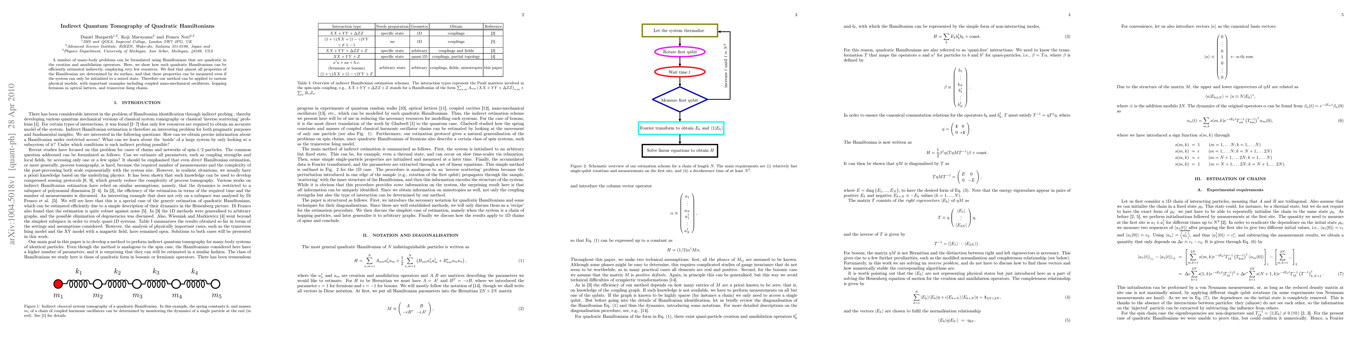 A number of many-body problems can be formulated using Hamiltonians that are quadratic in the creation and annihilation operators. Here, we show how such quadratic Hamiltonians can be efficiently estimated indirectly, employing very few resources. We find that almost all properties of the Hamiltonian are determined by its surface, and that these properties can be measured even if the system can only be initialised to a mixed state. Therefore our method can be applied to various physical models, with important examples including coupled nano-mechanical oscillators, hopping fermions in optical lattices, and transverse Ising chains.