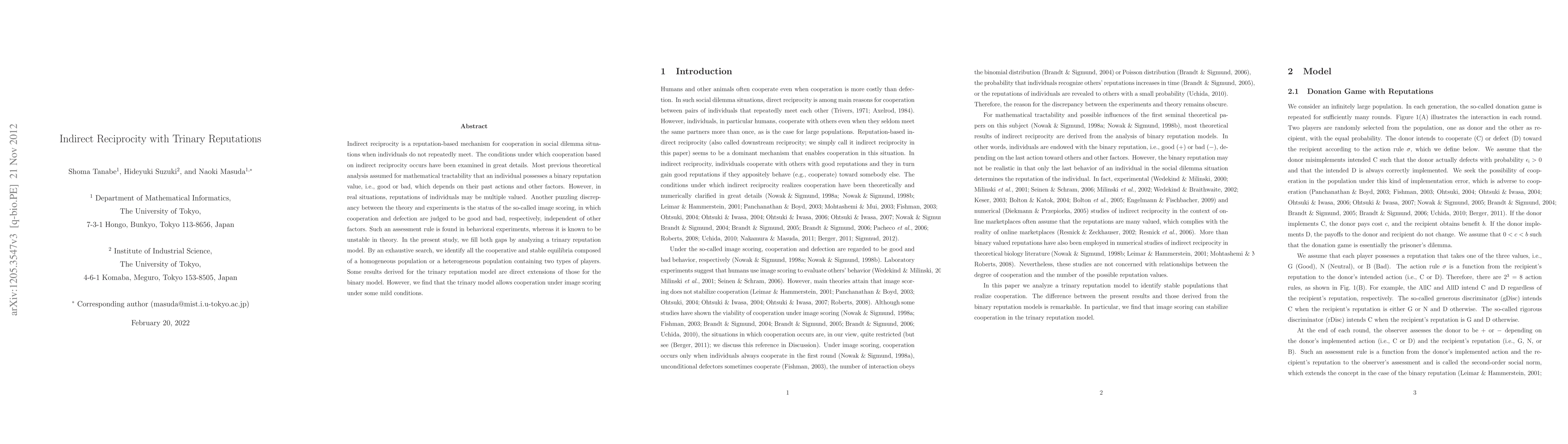 This paper investigates indirect reciprocity in social dilemmas using a trinary reputation model, addressing discrepancies between theoretical binary models and real-world multi-valued reputations. It identifies cooperative and stable equilibria in both homogeneous and heterogeneous populations, revealing that the trinary model can sustain cooperation under image scoring conditions.