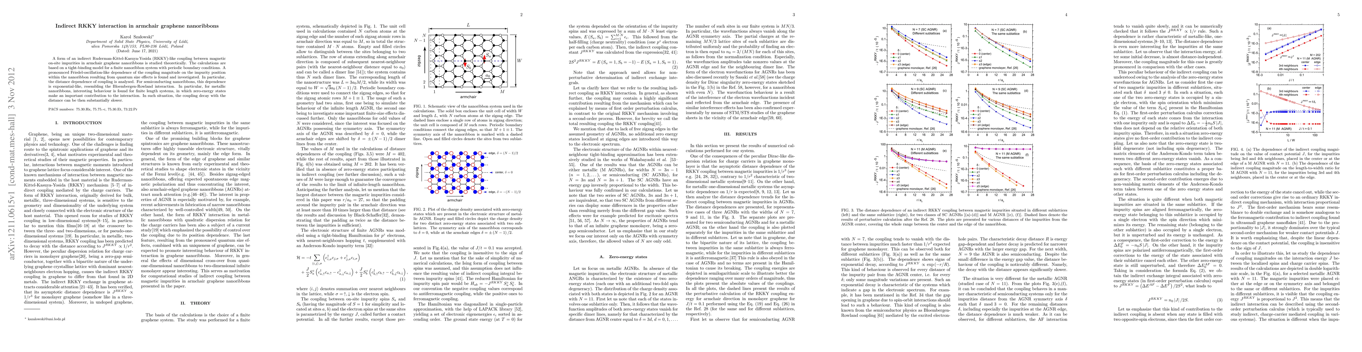 This paper investigates the indirect RKKY interaction between magnetic impurities in armchair graphene nanoribbons using a tight-binding model. It finds that the coupling magnitude varies significantly with impurity position due to quantum size effects, showing exponential decay in semiconducting nanoribbons and slower decay in metallic nanoribbons due to zero-energy states.