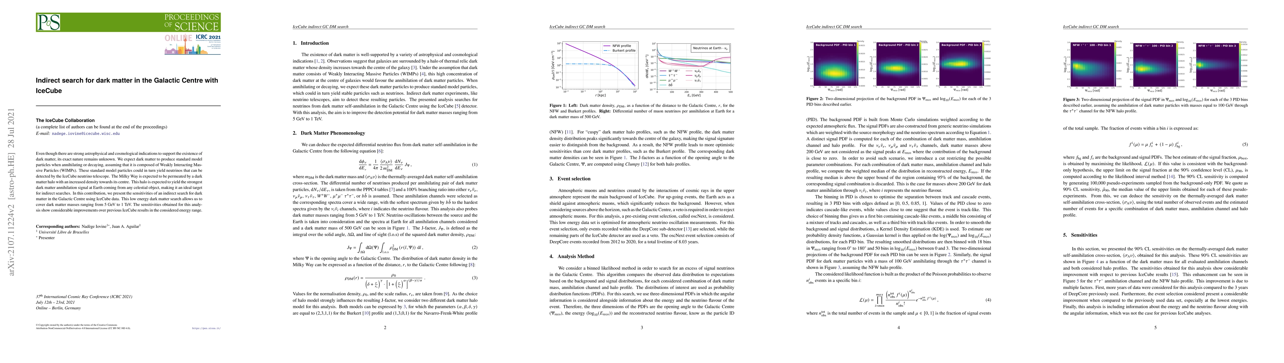 This paper investigates the Galactic Centre for dark matter signals using IceCube's neutrino detection, focusing on the annihilation of Weakly Interacting Massive Particles (WIMPs) in the Milky Way's dense dark matter halo. The analysis shows improved sensitivities over previous results, covering dark matter masses from 5 GeV to 1 TeV.