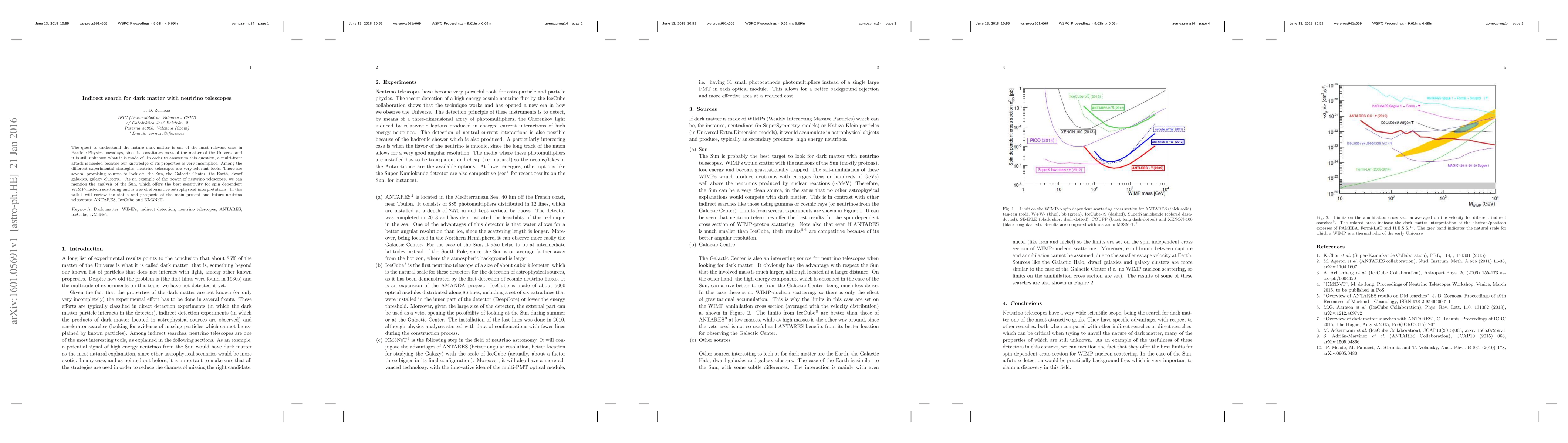 The quest to understand the nature dark matter is one of the most relevant ones in Particle Physics nowadays, since it constitutes most of the matter of the Universe and it is still unknown what it is made of. In order to answer to this question, a multi-front attack is needed because our knowledge of its properties is very incomplete. Among the different experimental strategies, neutrino telescopes are very relevant tools. There are several promising sources to look at: the Sun, the Galactic Center, the Earth, dwarf galaxies, galaxy clusters... As an example of the power of neutrino telescopes, we can mention the analysis of the Sun, which offers the best sensitivity for spin dependent WIMP-nucleon scattering and is free of alternative astrophysical interpretations. In this talk I will review the status and prospects of the main present and future neutrino telescopes: ANTARES, IceCube and KM3NeT.