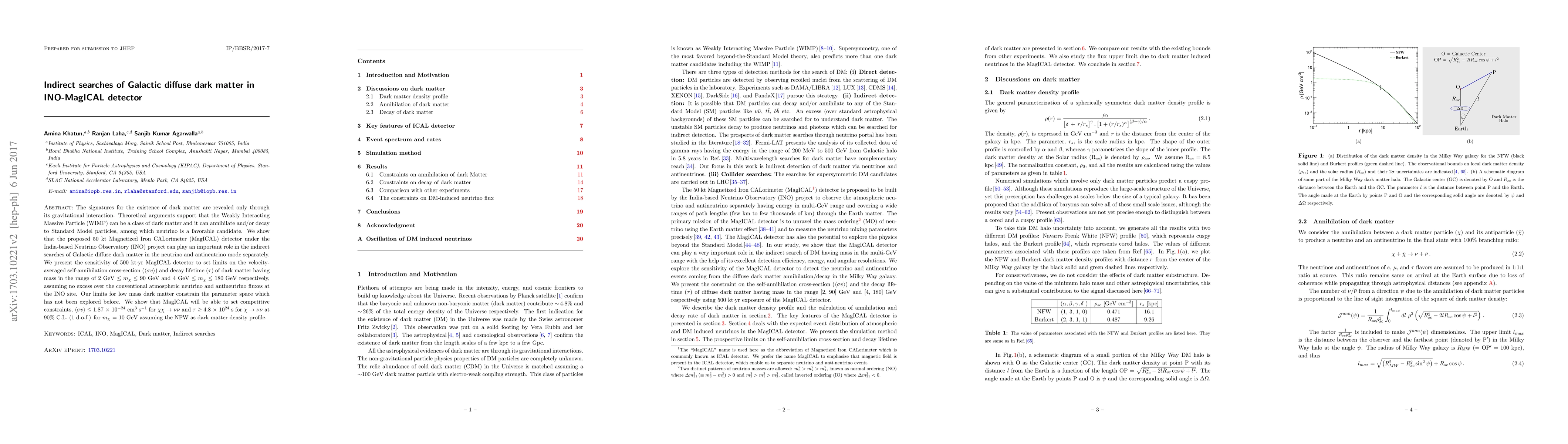 The signatures for the existence of dark matter are revealed only through its gravitational interaction. Theoretical arguments support that the Weakly Interacting Massive Particle (WIMP) can be a class of dark matter and it can annihilate and/or decay to Standard Model particles, among which neutrino is a favorable candidate. We show that the proposed 50 kt Magnetized Iron CALorimeter (MagICAL) detector under the India-based Neutrino Observatory (INO) project can play an important role in the indirect searches of Galactic diffuse dark matter in the neutrino and antineutrino mode separately. We present the sensitivity of 500 kt$\cdot$yr MagICAL detector to set limits on the velocity-averaged self-annihilation cross-section ($\langle\sigma v\rangle$) and decay lifetime ($\tau$) of dark matter having mass in the range of 2 GeV $\leq m_\chi \leq $ 90 GeV and 4 GeV $\leq m_\chi \leq $ 180 GeV respectively, assuming no excess over the conventional atmospheric neutrino and antineutrino fluxes at the INO site. Our limits for low mass dark matter constrain the parameter space which has not been explored before. We show that MagICAL will be able to set competitive constraints, $\langle\sigma v\rangle\leq 1.87\,\times\,10^{-24}$ cm$^3$ s$^{-1}$ for $\chi\chi\rightarrow\nu\bar\nu$ and $\tau\geq 4.8\,\times\,10^{24}$ s for $\chi\rightarrow\nu\bar\nu$ at 90$\%$ C.L. (1 d.o.f.) for $m_\chi$ = 10 GeV assuming the NFW as dark matter density profile.