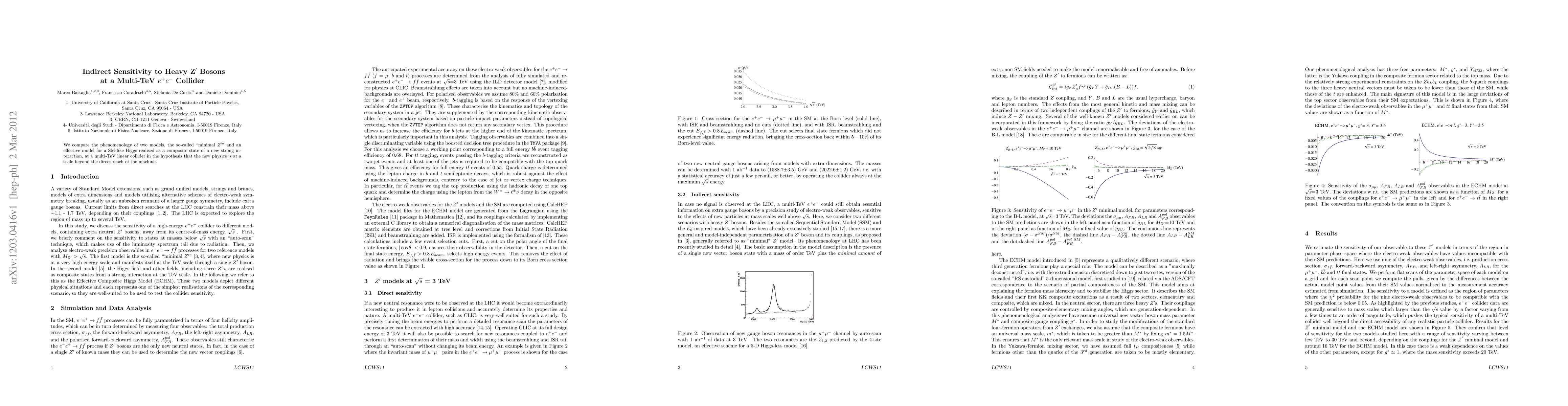 We compare the phenomenology of two models, the so-called minimal Z' and an effective model for a SM-like Higgs realised as a composite state of a new strong interaction, at a multi-TeV linear collider in the hypothesis that the new physics is at a scale beyond the direct reach of the machine.
