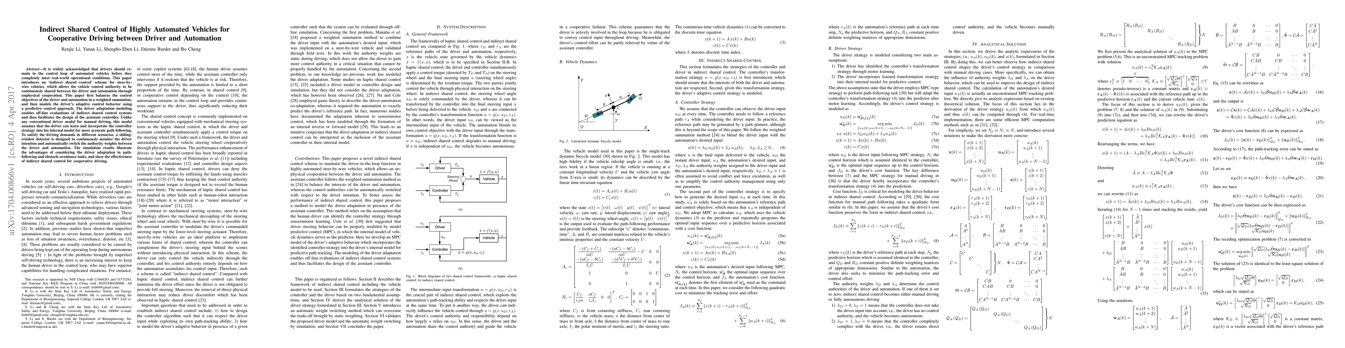 This paper proposes an "indirect shared control" scheme for steer-by-wire vehicles, enabling continuous cooperation between driver and automation through adaptive control. The model allows the driver to learn and integrate automation strategies, optimizing path-following and obstacle avoidance.