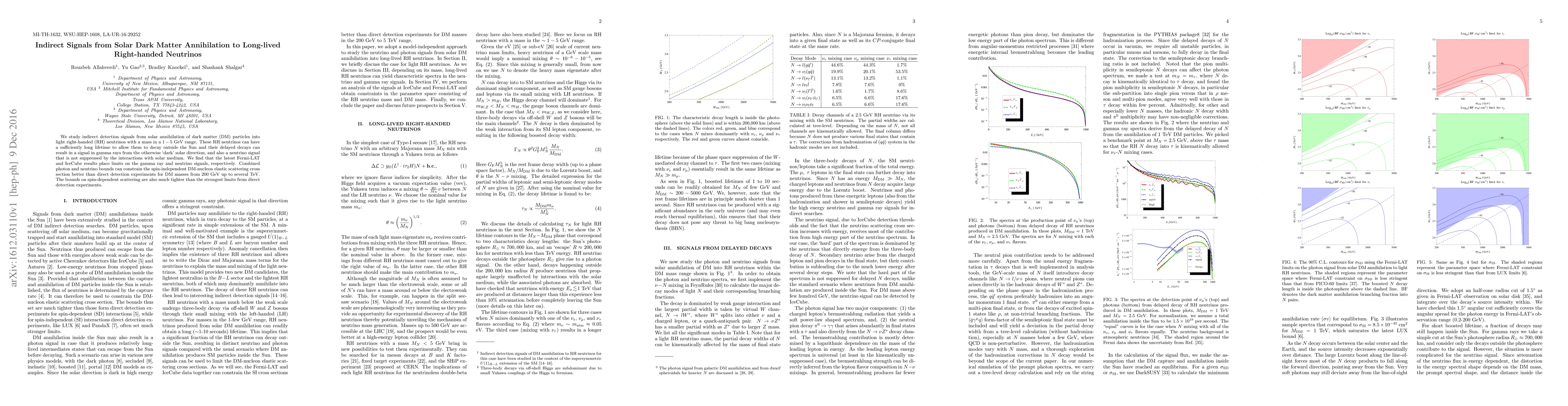 This paper investigates indirect detection signals from solar dark matter annihilation into long-lived right-handed neutrinos in the 1-5 GeV range. These neutrinos can decay outside the Sun, producing gamma rays and neutrinos that provide detectable signals, thus constraining dark matter properties.