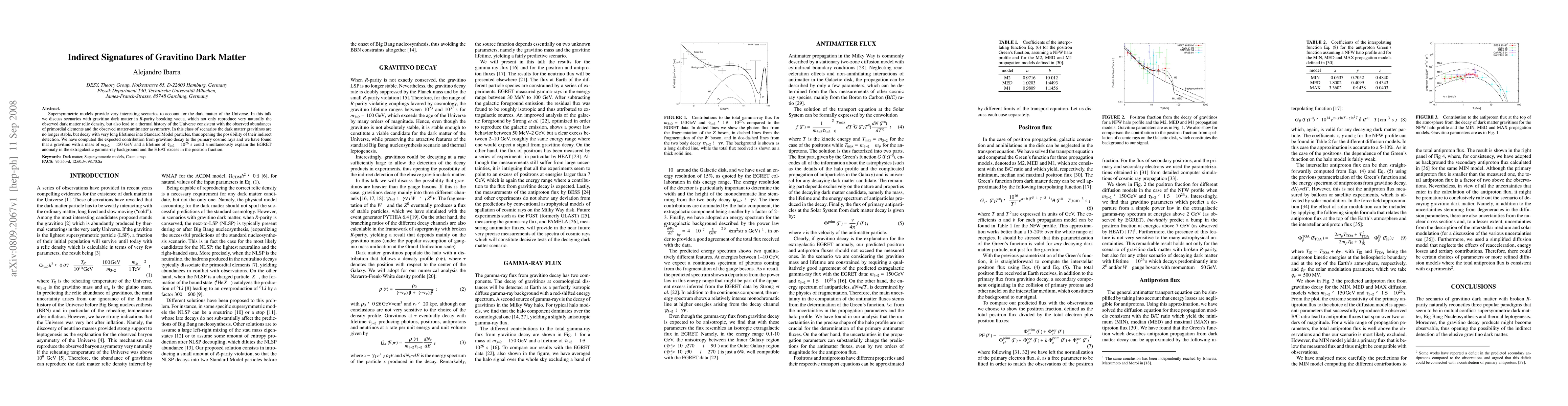 This paper explores supersymmetric models with gravitino dark matter in R-parity breaking scenarios, which naturally explain the observed dark matter density and cosmological abundances. Gravitinos in these models decay into Standard Model particles, potentially offering indirect detection through contributions to primary cosmic rays, such as explaining the EGRET anomaly and the HEAT excess.
