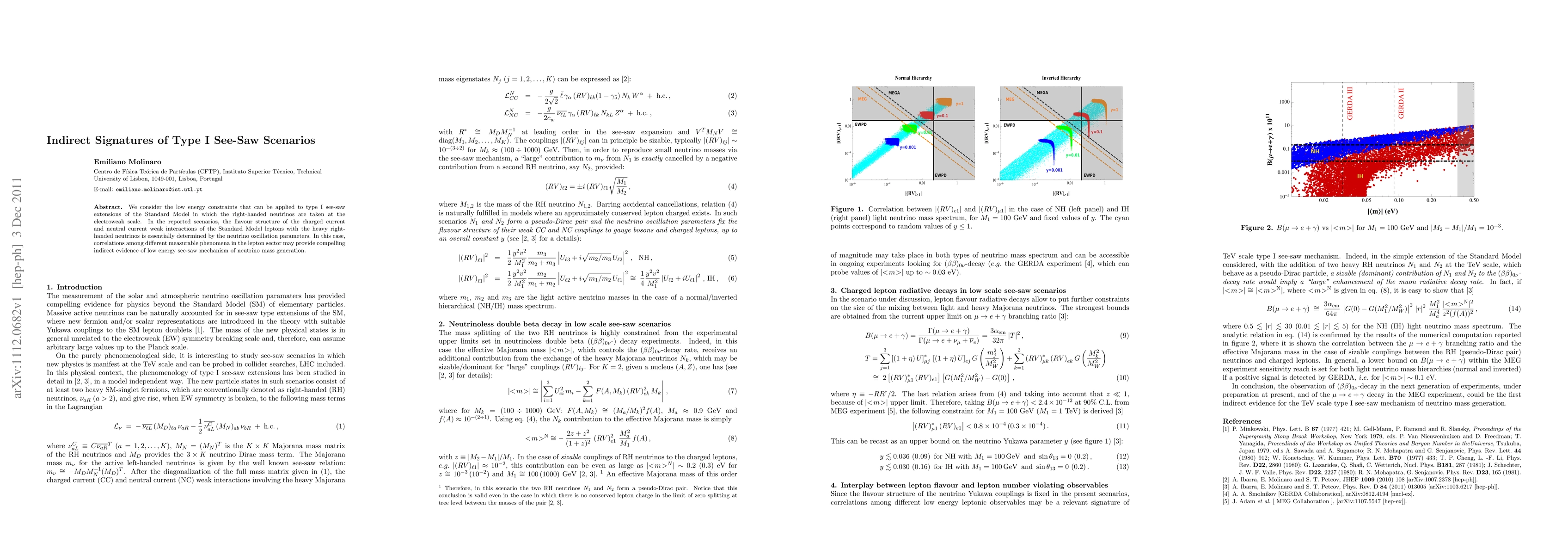 This paper explores low energy constraints on type I see-saw extensions of the Standard Model featuring right-handed neutrinos at the electroweak scale. It suggests that correlations among lepton sector phenomena, driven by neutrino oscillation parameters, may offer indirect evidence for the see-saw mechanism of neutrino mass generation.