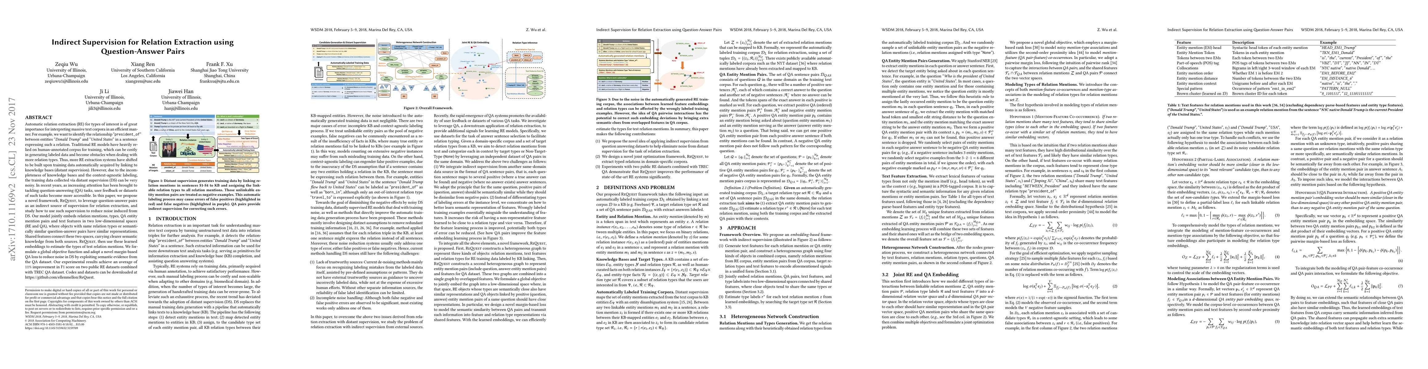 This paper proposes ReQuest, a framework leveraging question-answer pairs for indirect supervision to improve relation extraction using distant supervision, aiming to reduce noise and achieve a 11% average F1 score improvement on public datasets. The model jointly embeds relation mentions and QA pairs, utilizing shared features to enhance semantic knowledge and reduce noise.