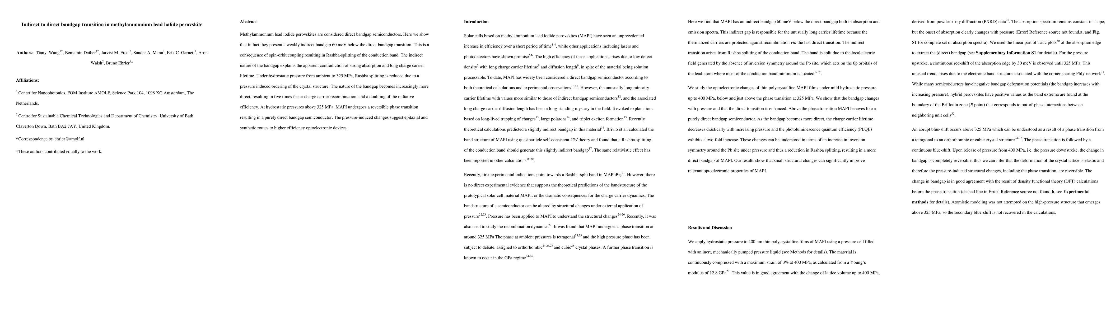 This study reveals that methylammonium lead iodide perovskites exhibit a weakly indirect bandgap due to spin-orbit coupling, explaining the strong absorption and long carrier lifetime. Under pressure, the bandgap transitions to direct, significantly enhancing charge recombination speed and radiative efficiency.
