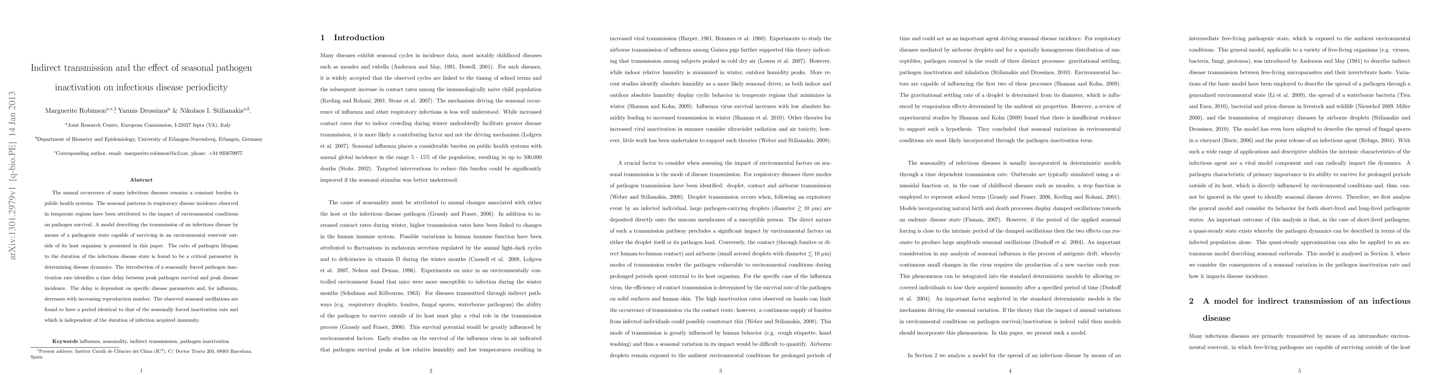 The annual occurrence of many infectious diseases remains a constant burden to public health systems. The seasonal patterns in respiratory disease incidence observed in temperate regions have been attributed to the impact of environmental conditions on pathogen survival. A model describing the transmission of an infectious disease by means of a pathogenic state capable of surviving in an environmental reservoir outside of its host organism is presented in this paper. The ratio of pathogen lifespan to the duration of the infectious disease state is found to be a critical parameter in determining disease dynamics. The introduction of a seasonally forced pathogen inactivation rate identifies a time delay between peak pathogen survival and peak disease incidence. The delay is dependent on specific disease parameters and, for influenza, decreases with increasing reproduction number. The observed seasonal oscillations are found to have a period identical to that of the seasonally forced inactivation rate and which is independent of the duration of infection acquired immunity