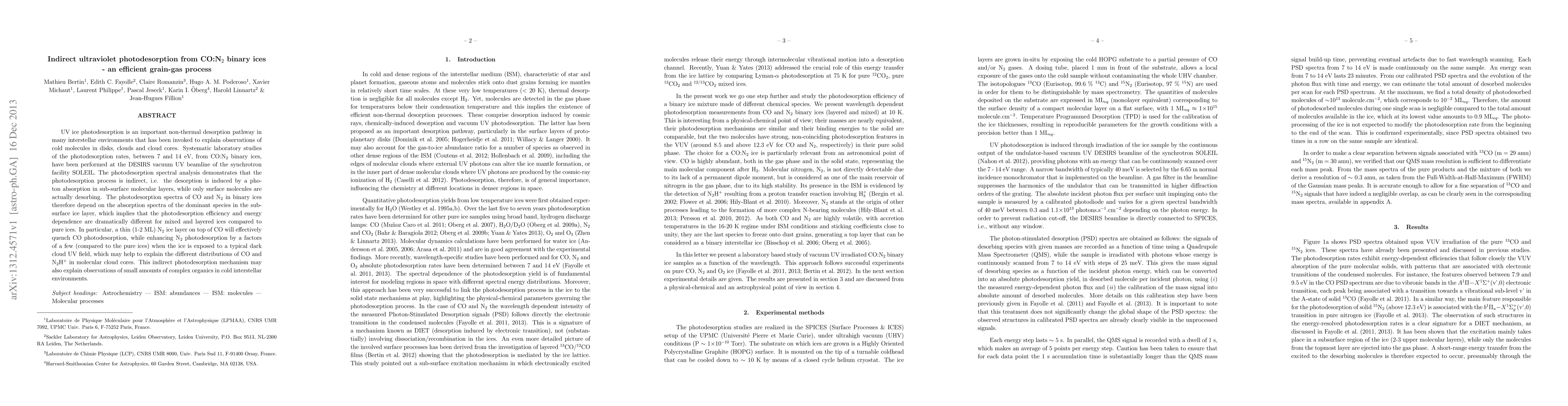 Systematic laboratory studies of photodesorption rates from CO:N2 binary ices using the DESIRS vacuum UV beamline at the SOLEIL synchrotron facility, covering 7-14 eV photon energies with 40 meV resolution.
