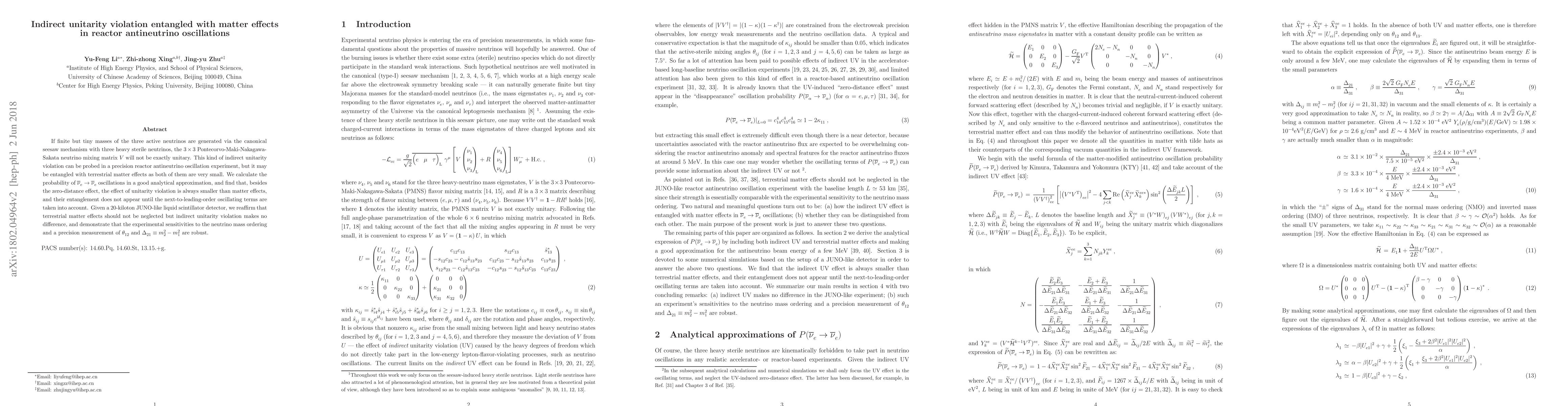 This paper investigates the indirect violation of unitarity in neutrino oscillations due to tiny neutrino masses generated via the seesaw mechanism, and its interplay with terrestrial matter effects in reactor antineutrino experiments. It concludes that while matter effects dominate, indirect unitarity violation remains negligible and does not affect the experimental sensitivity to neutrino mass ordering and mixing angles.