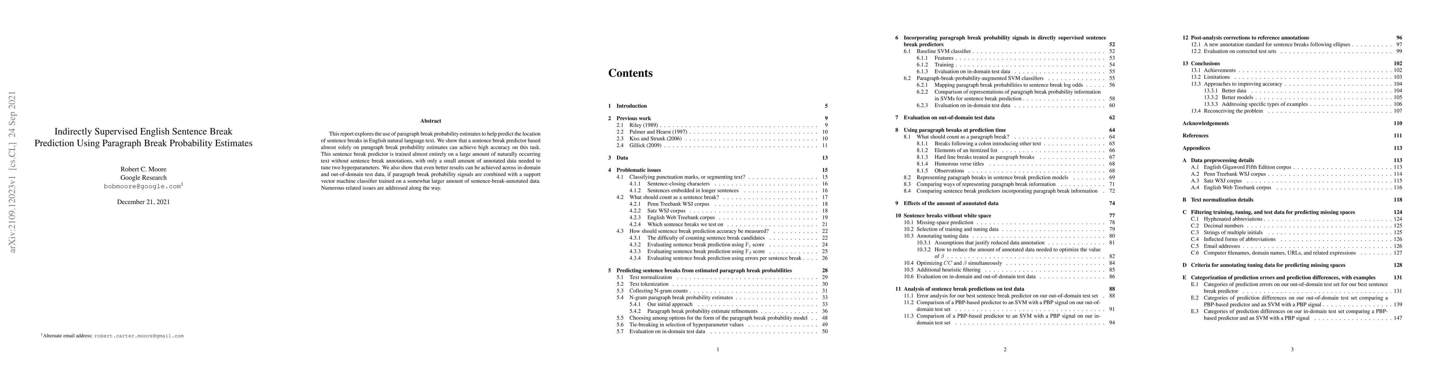 This paper proposes a method for predicting English sentence breaks using paragraph break probability estimates, achieving high accuracy with minimal annotated data. Combining these estimates with a support vector machine classifier trained on annotated data further improves performance across different datasets.