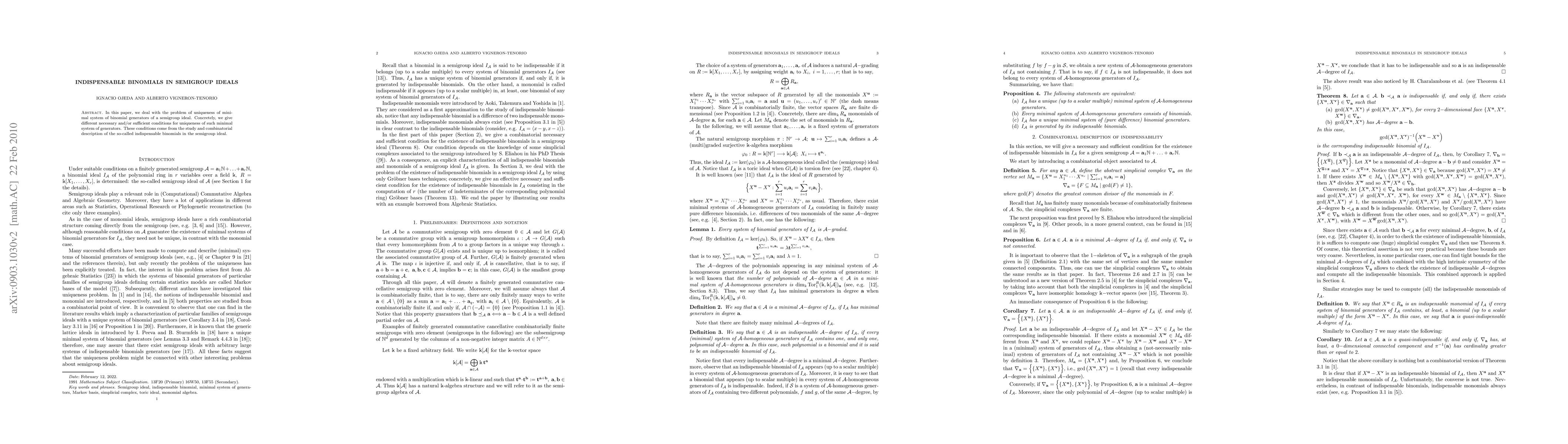 In this paper, we deal with the problem of uniqueness of minimal system of binomial generators of a semigroup ideal. Concretely, we give different necessary and/or sufficient conditions for uniqueness of such minimal system of generators. These conditions come from the study and combinatorial description of the so-called indispensable binomials in the semigroup ideal.