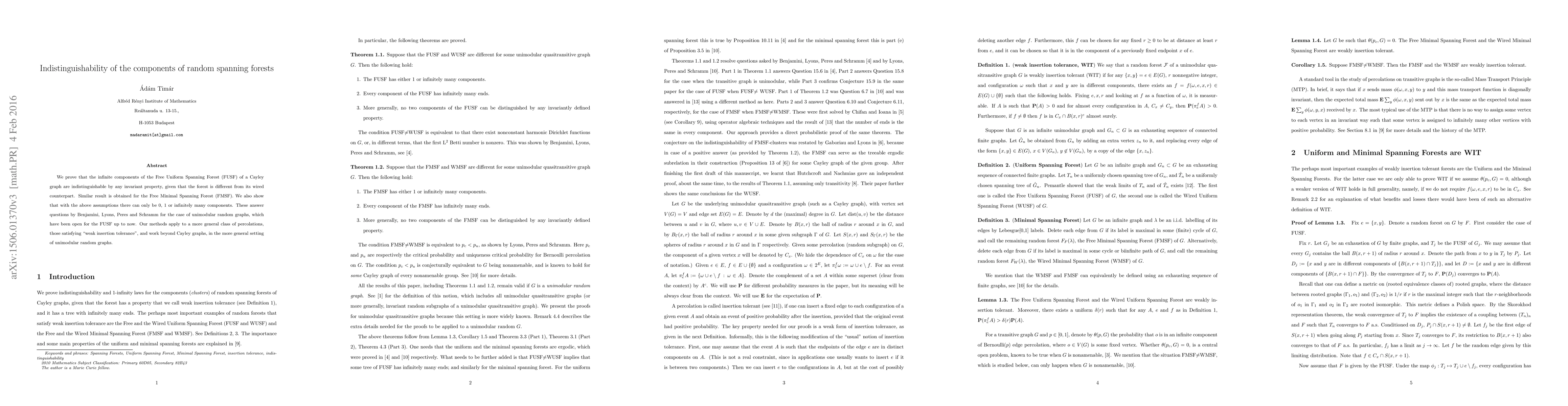 This paper proves that in random spanning forests of Cayley graphs, the infinite components are indistinguishable by any invariant property when the forest differs from its wired counterpart. It also shows that under these conditions, there can only be 0, 1, or infinitely many components, extending to a broader class of unimodular random graphs.