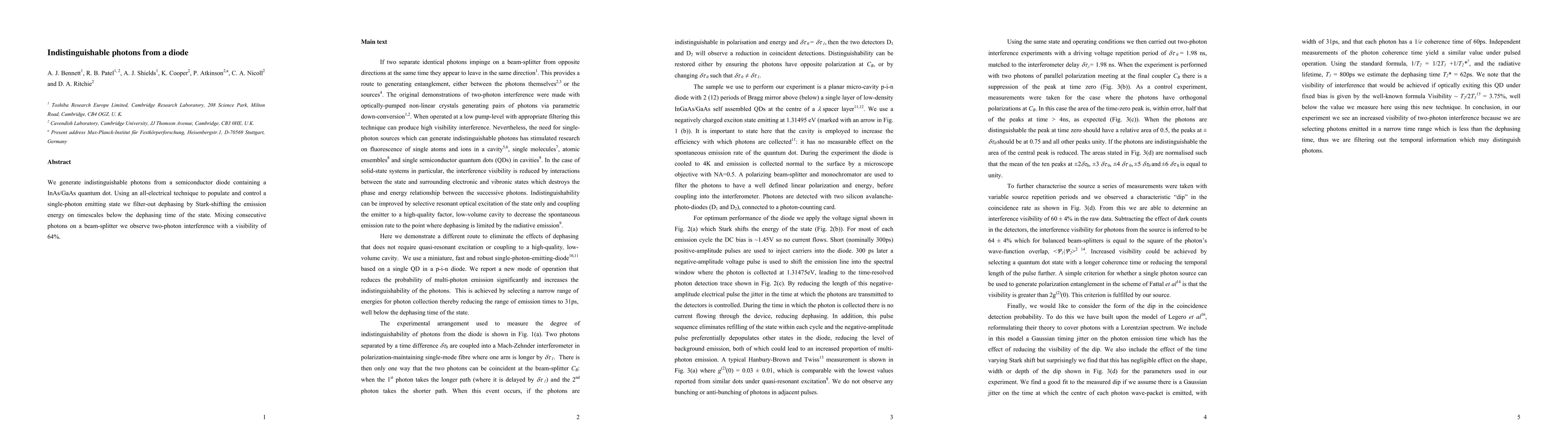 The paper details the generation of indistinguishable photons from a semiconductor diode with an InAs/GaAs quantum dot, achieved through an all-electrical technique, and demonstrates two-photon interference with 64% visibility by filtering dephasing and Stark-shifting the emission energy.