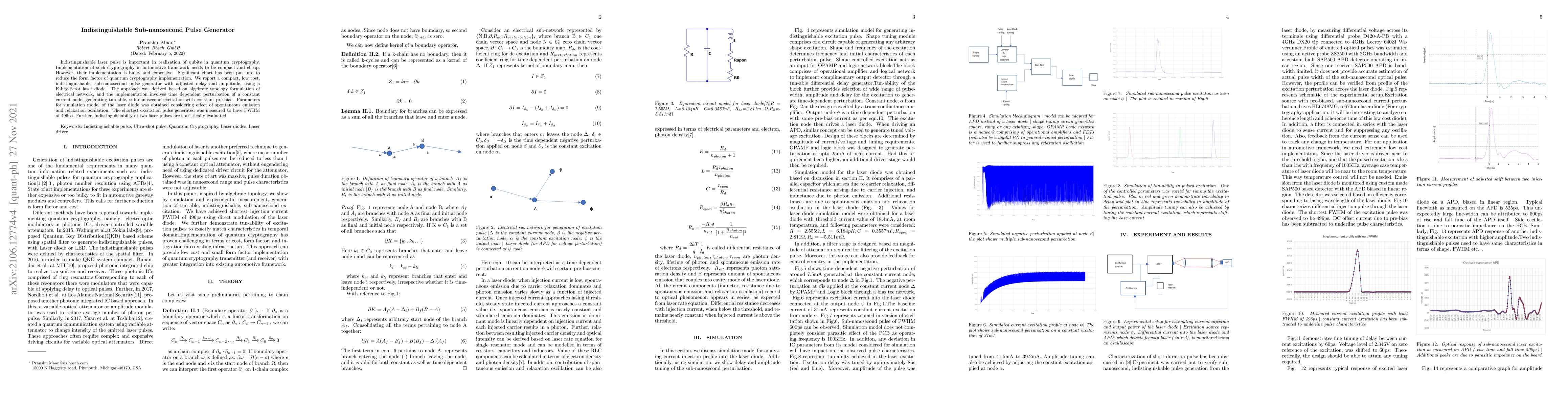 Indistinguishable laser pulse is important in realization of qubits in quantum cryptography. Implementation of such cryptography in automotive framework needs to be compact and cheap. However, modern implementation of quantum cryptography is bulky and expensive. Significant effort has been put into to reduce the form factor of quantum cryptography implementation. We report a compact, low cost, indistinguishable, sub-nanosecond pulse generator with adjusted delay and amplitude using a Fabry-Perot laser diode. The approach was derived based on algebraic topology formulation of electrical network, and the implementation is time dependent perturbation of a constant current node, generating tun-able, sub-nanosecond excitation with constant pre-bias. Parameters for simulation model for the laser diode was obtained considering effect of spontaneous emission and relaxation oscillation. The shortest pulse was measured to have FWHM of 496ps.