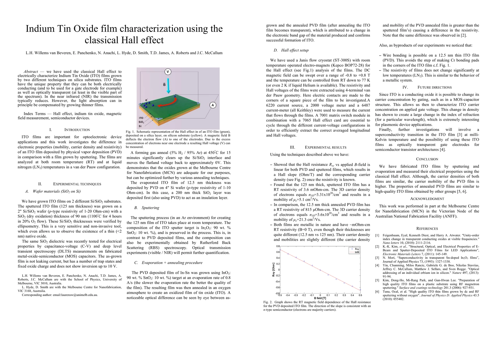 We have used the classical Hall effect to electrically characterize Indium Tin Oxide (ITO) films grown by two different techniques on silica substrates. ITO films have the unique property that they can be both electrically conducting (and to be used for a gate electrode for example) as well as optically transparent (at least in the visible part of the spectrum). In the near infrared (NIR) the transmission typically reduces. However, the light absorption can in principle be compensated by growing thinner films.