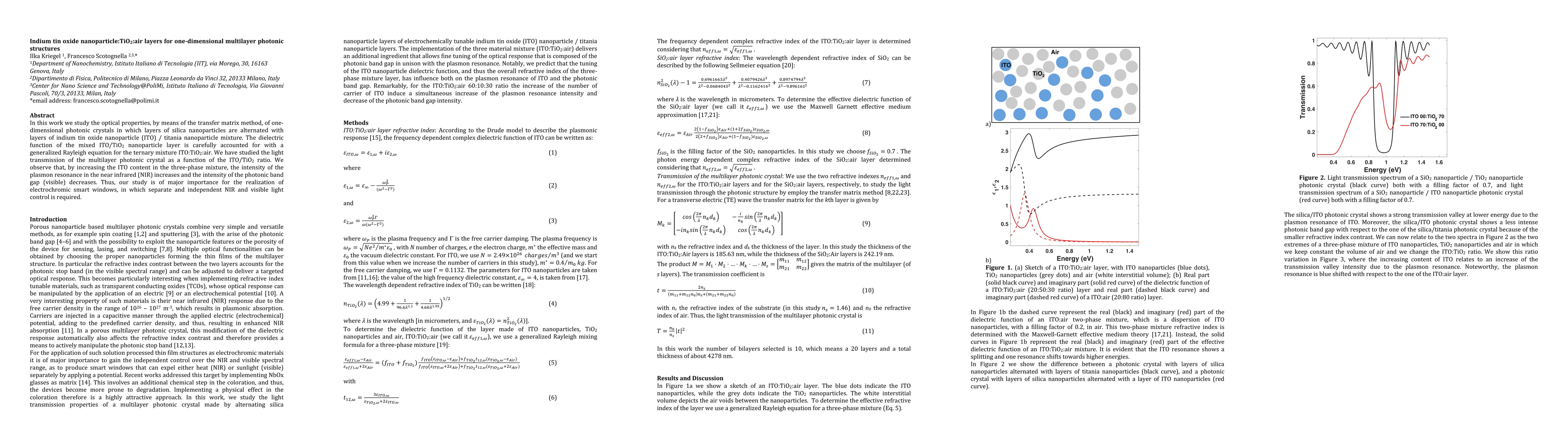 In this work we study the optical properties, by means of the transfer matrix method, of one-dimensional photonic crystals in which layers of silica nanoparticles are alternated with layers of indium tin oxide nanoparticle (ITO) / titania nanoparticle mixture. The dielectric function of the mixed ITO/TiO$_{2}$ nanoparticle layer is carefully accounted for with a generalized Rayleigh equation for the ternary mixture ITO:TiO$_{2}$:air. We have studied the light transmission of the multilayer photonic crystal as a function of the ITO/TiO$_{2}$ ratio. We observe that, by increasing the ITO content in the three-phase mixture, the intensity of the plasmon resonance in the near infrared (NIR) increases and the intensity of the photonic band gap (visible) decreases. Thus, our study is of major importance for the realization of electrochromic smart windows, in which separate and independent NIR and visible light control is required.