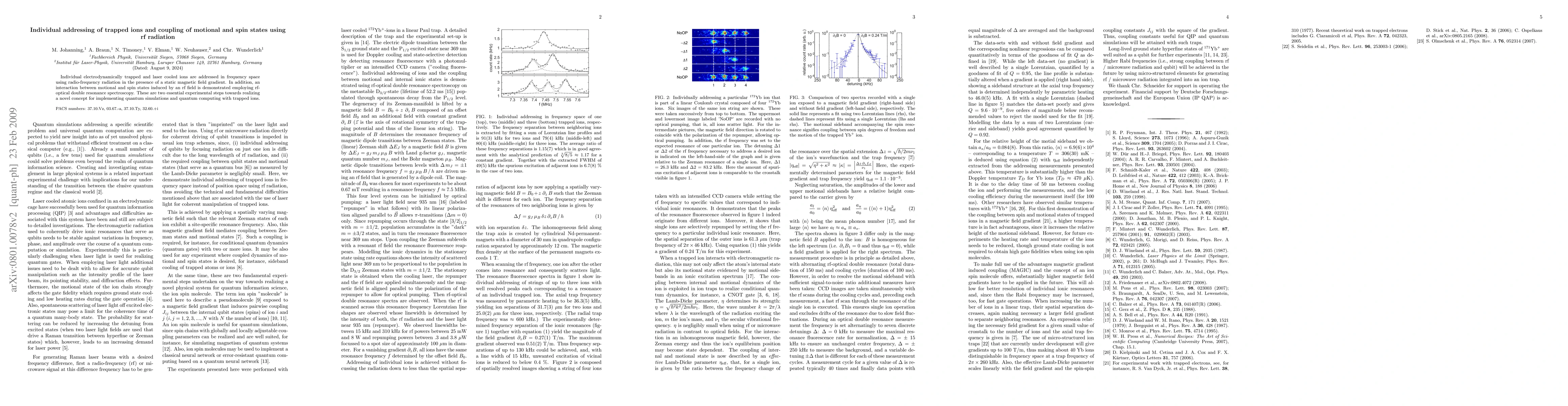 Individual electrodynamically trapped and laser cooled ions are addressed in frequency space using radio-frequency radiation in the presence of a static magnetic field gradient. In addition, an interaction between motional and spin states induced by an rf field is demonstrated employing rf-optical double resonance spectroscopy. These are two essential experimental steps towards realizing a novel concept for implementing quantum simulations and quantum computing with trapped ions.