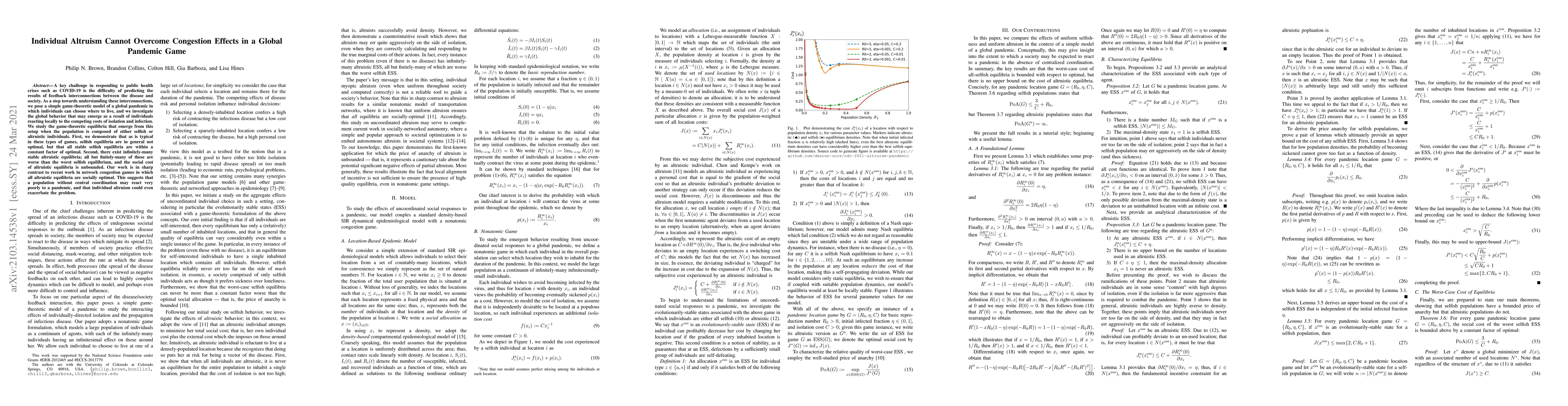 This paper uses a game-theoretic model to show that individual altruism cannot overcome congestion effects in a global pandemic, leading to suboptimal outcomes. While altruistic equilibria exist, most are worse than selfish ones, indicating that decentralized altruism may not effectively mitigate pandemic impacts.