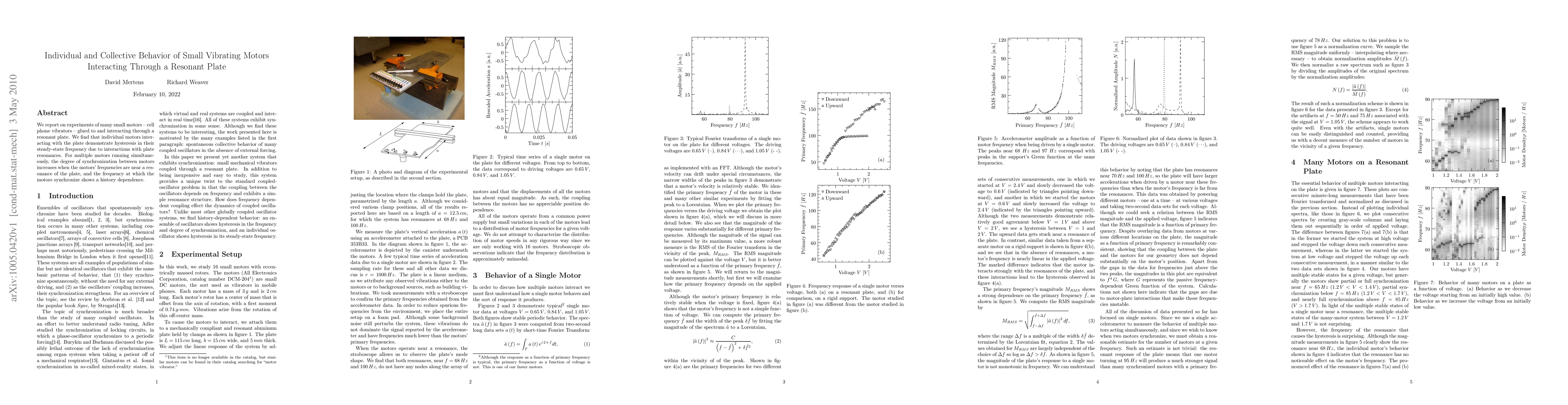 We report on experiments of many small motors -- cell phone vibrators -- glued to and interacting through a resonant plate. We find that individual motors interacting with the plate demonstrate hysteresis in their steady-state frequency due to interactions with plate resonances. For multiple motors running simultaneously, the degree of synchronization between motors increases when the motors' frequencies are near a resonance of the plate, and the frequency at which the motors synchronize shows a history dependence.