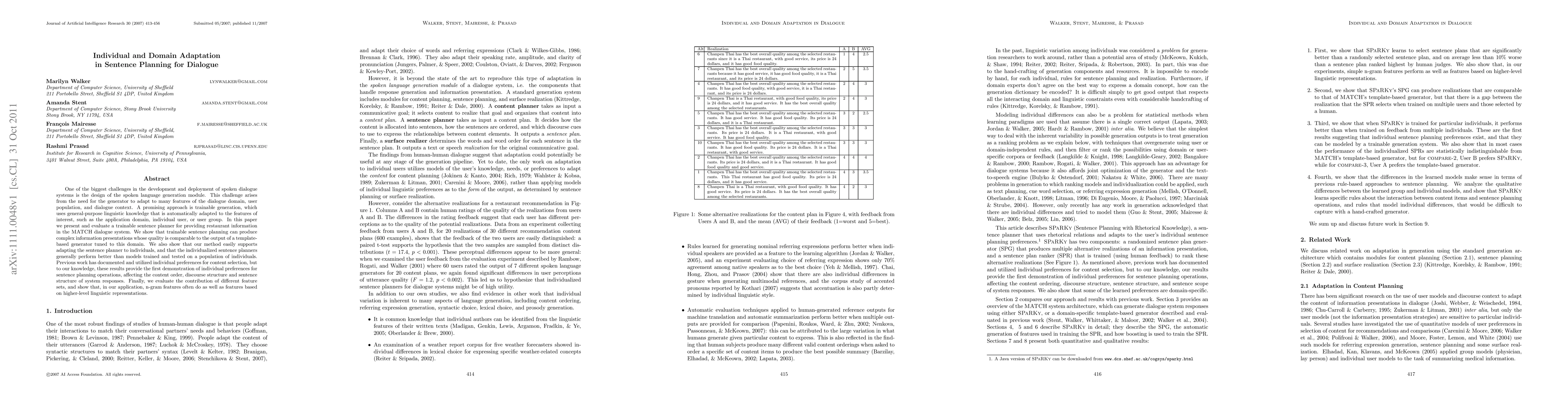 One of the biggest challenges in the development and deployment of spoken dialogue systems is the design of the spoken language generation module. This challenge arises from the need for the generator to adapt to many features of the dialogue domain, user population, and dialogue context. A promising approach is trainable generation, which uses general-purpose linguistic knowledge that is automatically adapted to the features of interest, such as the application domain, individual user, or user group. In this paper we present and evaluate a trainable sentence planner for providing restaurant information in the MATCH dialogue system. We show that trainable sentence planning can produce complex information presentations whose quality is comparable to the output of a template-based generator tuned to this domain. We also show that our method easily supports adapting the sentence planner to individuals, and that the individualized sentence planners generally perform better than models trained and tested on a population of individuals. Previous work has documented and utilized individual preferences for content selection, but to our knowledge, these results provide the first demonstration of individual preferences for sentence planning operations, affecting the content order, discourse structure and sentence structure of system responses. Finally, we evaluate the contribution of different feature sets, and show that, in our application, n-gram features often do as well as features based on higher-level linguistic representations.