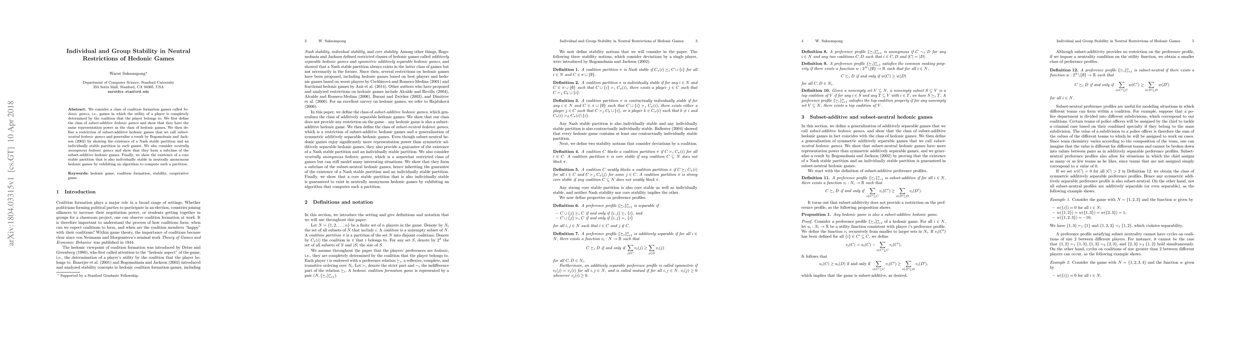 This paper explores coalition formation in hedonic games, proving the existence of Nash stable and individually stable partitions in subset-neutral hedonic games. It also introduces neutrally anonymous hedonic games and demonstrates the existence of a core stable, individually stable partition in these games via an algorithmic approach.