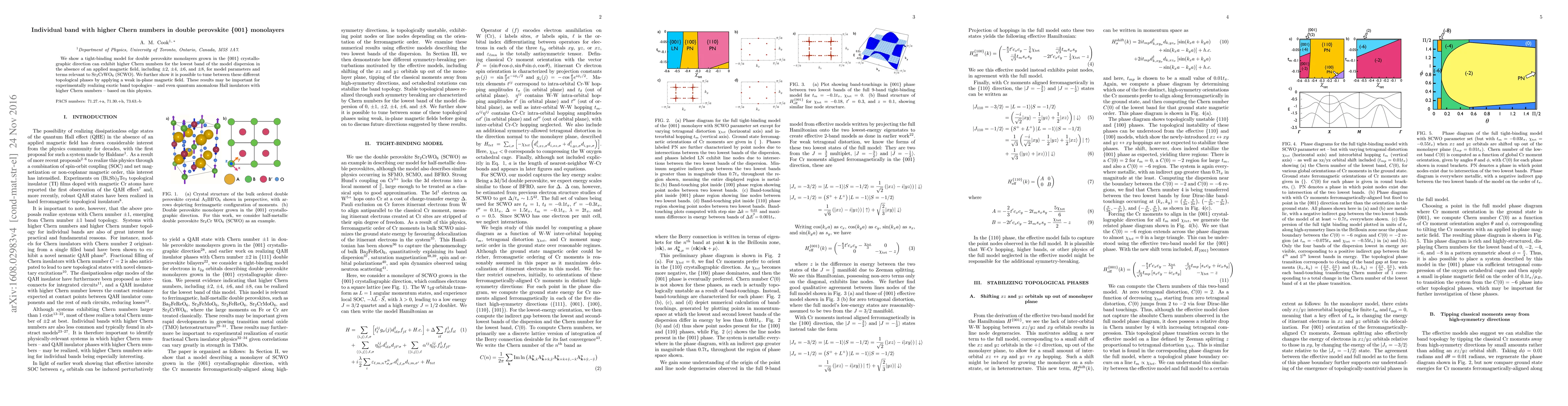 We show a tight-binding model for double perovskite monolayers grown in the {001} crystallographic direction can exhibit higher Chern numbers for the lowest band of the model dispersion in the absence of an applied magnetic field, including $\pm2$, $\pm4$, $\pm6$, and $\pm8$, for model parameters and terms relevant to Sr$_2$CrWO$_6$ (SCWO). We further show it is possible to tune between these different topological phases by applying a weak in-plane magnetic field. These results may be important for experimentally realizing exotic band topologies -- and even quantum anomalous Hall insulators with higher Chern numbers -- based on this physics.