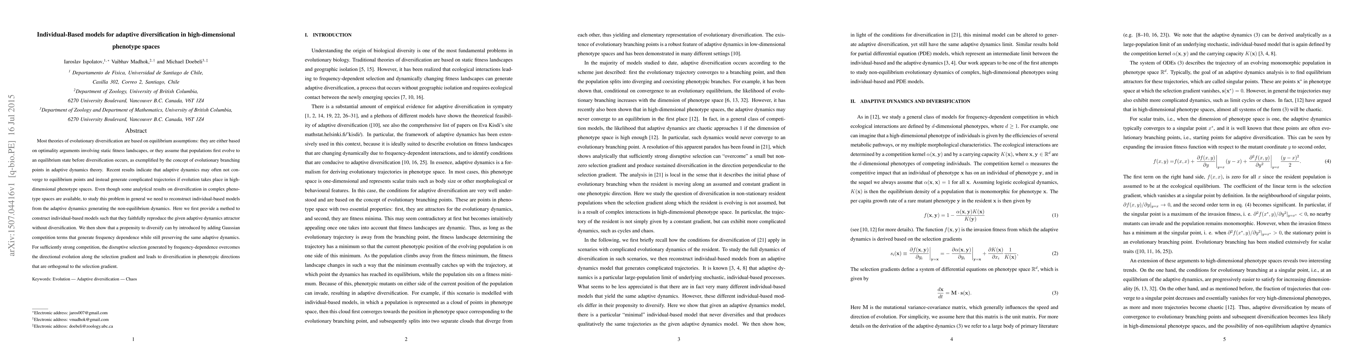 This paper develops individual-based models to study adaptive diversification in high-dimensional phenotype spaces, where traditional equilibrium-based theories fail. It introduces a method to reconstruct these models from adaptive dynamics, and shows how diversification can be induced by adding Gaussian competition terms to generate frequency-dependent disruptive selection.