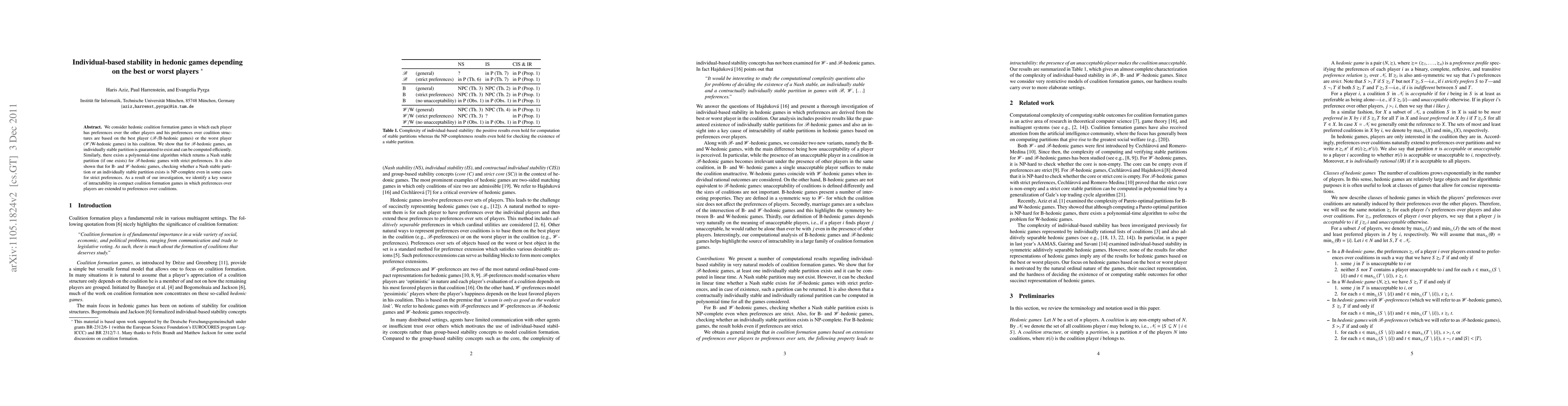 This research paper investigates stability in hedonic games with preferences over individual players or worst/best players. It shows that some types of games have guaranteed stable partitions, while others are NP-complete to solve.