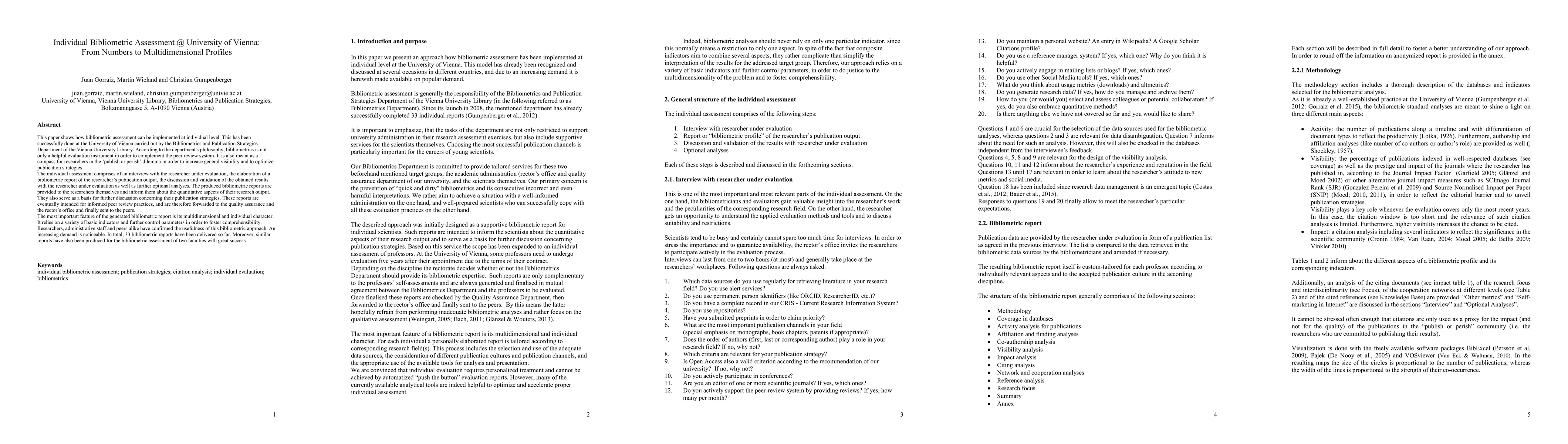 This paper shows how bibliometric assessment can be implemented at individual level. This has been successfully done at the University of Vienna carried out by the Bibliometrics and Publication Strategies Department of the Vienna University Library. According to the department's philosophy, bibliometrics is not only a helpful evaluation instrument in order to complement the peer review system. It is also meant as a compass for researchers in the "publish or perish" dilemma in order to increase general visibility and to optimize publication strategies. The individual assessment comprises of an interview with the researcher under evaluation, the elaboration of a bibliometric report of the researcher's publication output, the discussion and validation of the obtained results with the researcher under evaluation as well as further optional analyses. The produced bibliometric reports are provided to the researchers themselves and inform them about the quantitative aspects of their research output. They also serve as a basis for further discussion concerning their publication strategies. These reports are eventually intended for informed peer review practices, and are therefore forwarded to the quality assurance and the rector's office and finally sent to the peers. The most important feature of the generated bibliometric report is its multidimensional and individual character. It relies on a variety of basic indicators and further control parameters in order to foster comprehensibility. Researchers, administrative staff and peers alike have confirmed the usefulness of this bibliometric approach. An increasing demand is noticeable. In total, 33 bibliometric reports have been delivered so far. Moreover, similar reports have also been produced for the bibliometric assessment of two faculties with great success.