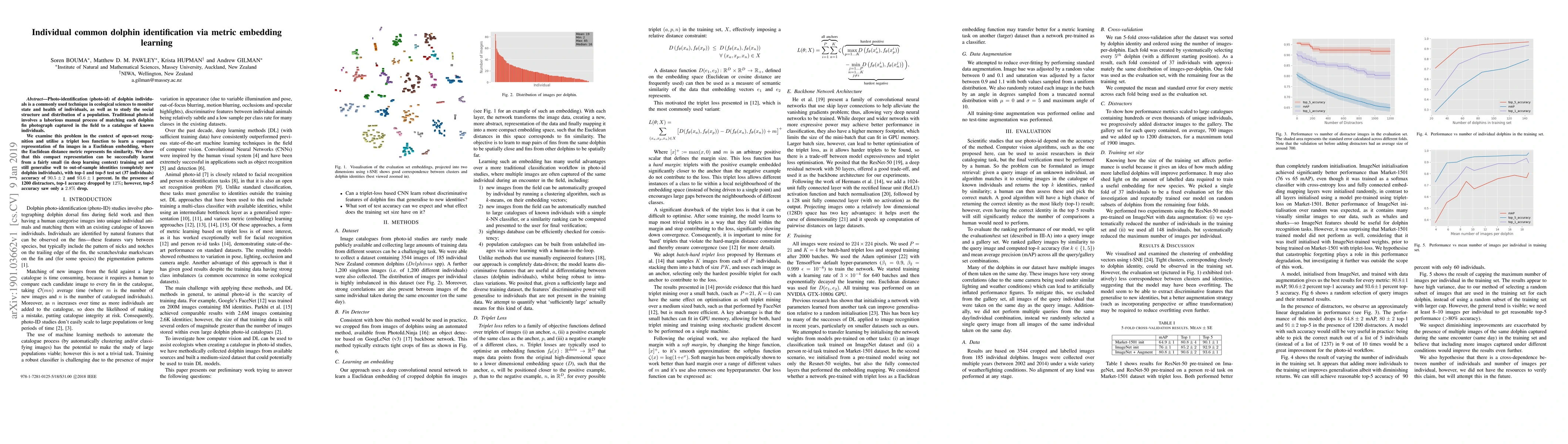 Photo-identification (photo-id) of dolphin individuals is a commonly used technique in ecological sciences to monitor state and health of individuals, as well as to study the social structure and distribution of a population. Traditional photo-id involves a laborious manual process of matching each dolphin fin photograph captured in the field to a catalogue of known individuals. We examine this problem in the context of open-set recognition and utilise a triplet loss function to learn a compact representation of fin images in a Euclidean embedding, where the Euclidean distance metric represents fin similarity. We show that this compact representation can be successfully learnt from a fairly small (in deep learning context) training set and still generalise well to out-of-sample identities (completely new dolphin individuals), with top-1 and top-5 test set (37 individuals) accuracy of $90.5\pm2$ and $93.6\pm1$ percent. In the presence of 1200 distractors, top-1 accuracy dropped by $12\%$; however, top-5 accuracy saw only a $2.8\%$ drop