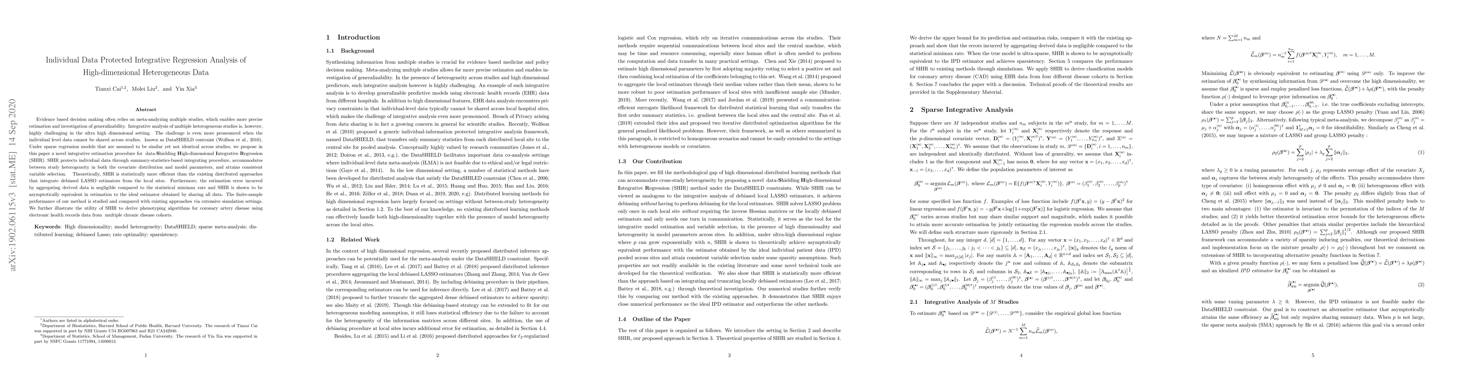 This paper proposes a novel SHIR method for integrative analysis of high-dimensional, heterogeneous data under the DataSHIELD constraint, where individual-level data cannot be shared. SHIR achieves consistent variable selection and is statistically more efficient than existing distributed approaches, while maintaining individual data protection through a summary-statistics-based integrating procedure.