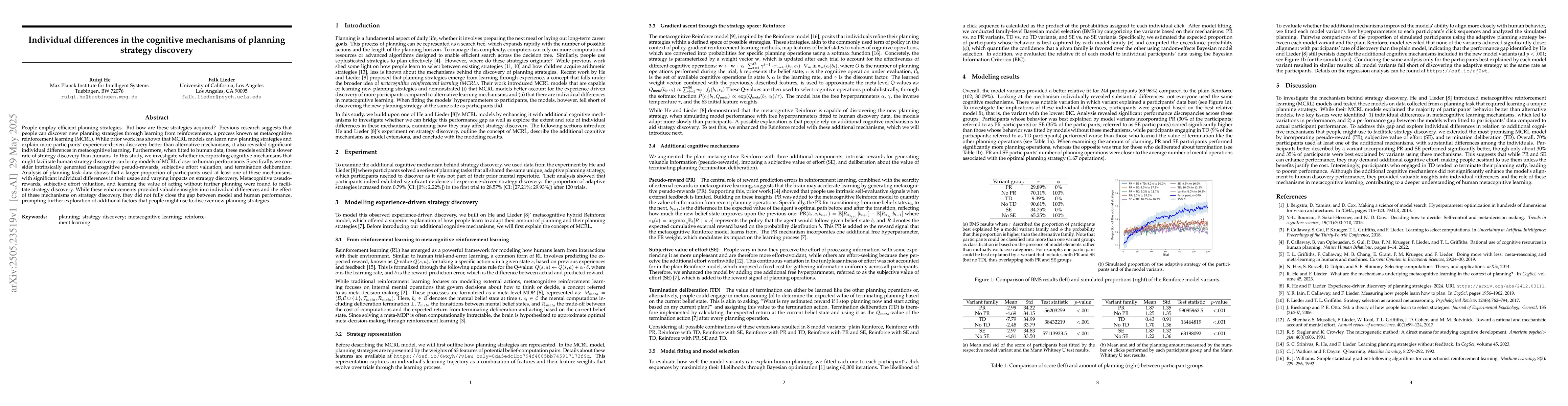 A study investigates how individual differences in cognitive mechanisms can improve planning strategy discovery models, finding that metacognitive pseudo-rewards, subjective effort valuation, and learning the value of acting without further planning facilitate strategy discovery.