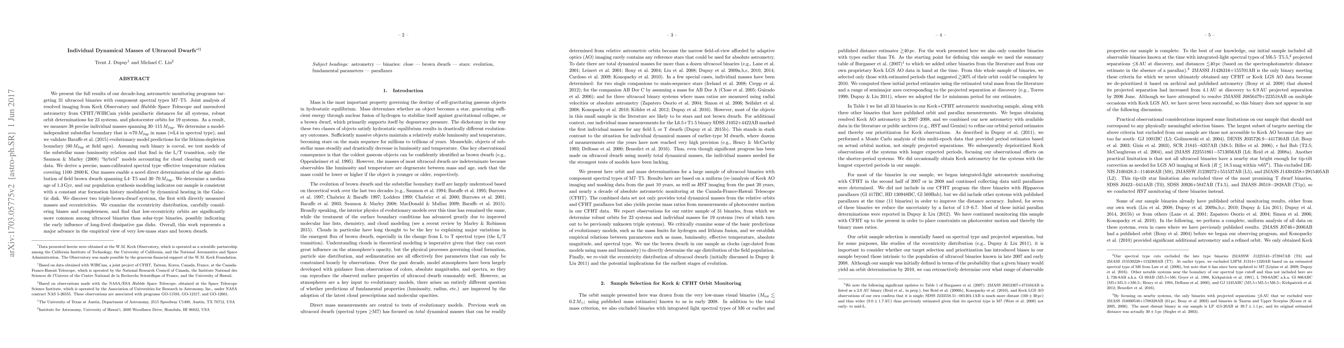 We present the full results of our decade-long astrometric monitoring programs targeting 31 ultracool binaries with component spectral types M7-T5. Joint analysis of resolved imaging from Keck Observatory and Hubble Space Telescope and unresolved astrometry from CFHT/WIRCam yields parallactic distances for all systems, robust orbit determinations for 23 systems, and photocenter orbits for 19 systems. As a result, we measure 38 precise individual masses spanning 30-115 $M_{\rm Jup}$. We determine a model-independent substellar boundary that is $\approx$70 $M_{\rm Jup}$ in mass ($\approx$L4 in spectral type), and we validate Baraffe et al. (2015) evolutionary model predictions for the lithium-depletion boundary (60 $M_{\rm Jup}$ at field ages). Assuming each binary is coeval, we test models of the substellar mass-luminosity relation and find that in the L/T transition, only the Saumon & Marley (2008) "hybrid" models accounting for cloud clearing match our data. We derive a precise, mass-calibrated spectral type-effective temperature relation covering 1100-2800 K. Our masses enable a novel direct determination of the age distribution of field brown dwarfs spanning L4-T5 and 30-70 $M_{\rm Jup}$. We determine a median age of 1.3 Gyr, and our population synthesis modeling indicates our sample is consistent with a constant star formation history modulated by dynamical heating in the Galactic disk. We discover two triple-brown-dwarf systems, the first with directly measured masses and eccentricities. We examine the eccentricity distribution, carefully considering biases and completeness, and find that low-eccentricity orbits are significantly more common among ultracool binaries than solar-type binaries, possibly indicating the early influence of long-lived dissipative gas disks. Overall, this work represents a major advance in the empirical view of very low-mass stars and brown dwarfs.