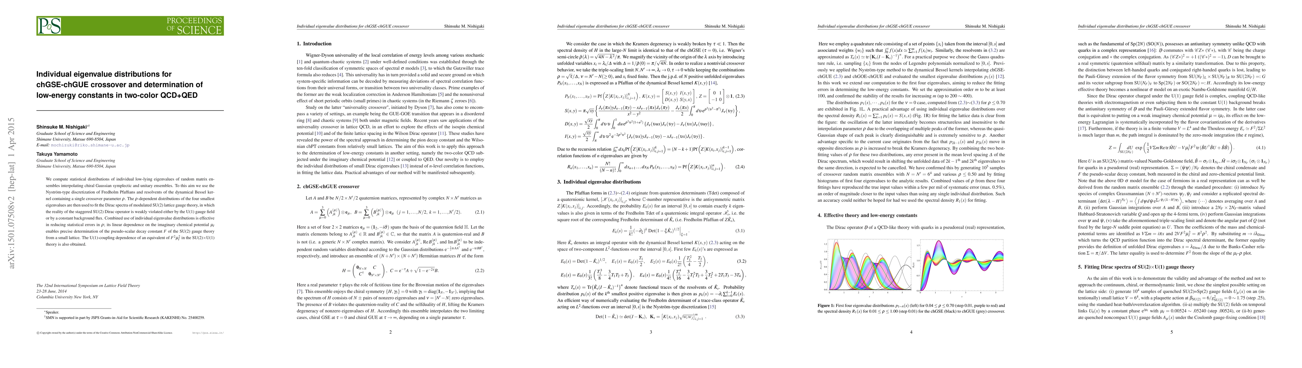 This paper computes the statistical distributions of low-lying eigenvalues for random matrix ensembles that transition between chiral Gaussian symplectic and unitary ensembles, using a Nyström-type discretization. The study determines low-energy constants in two-color QCD+QED by fitting Dirac spectra of modulated SU(2) lattice gauge theory, achieving precise determination of the pseudo-scalar decay constant F.